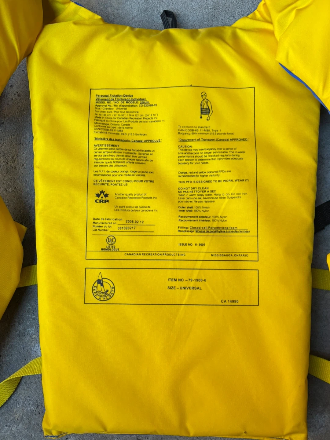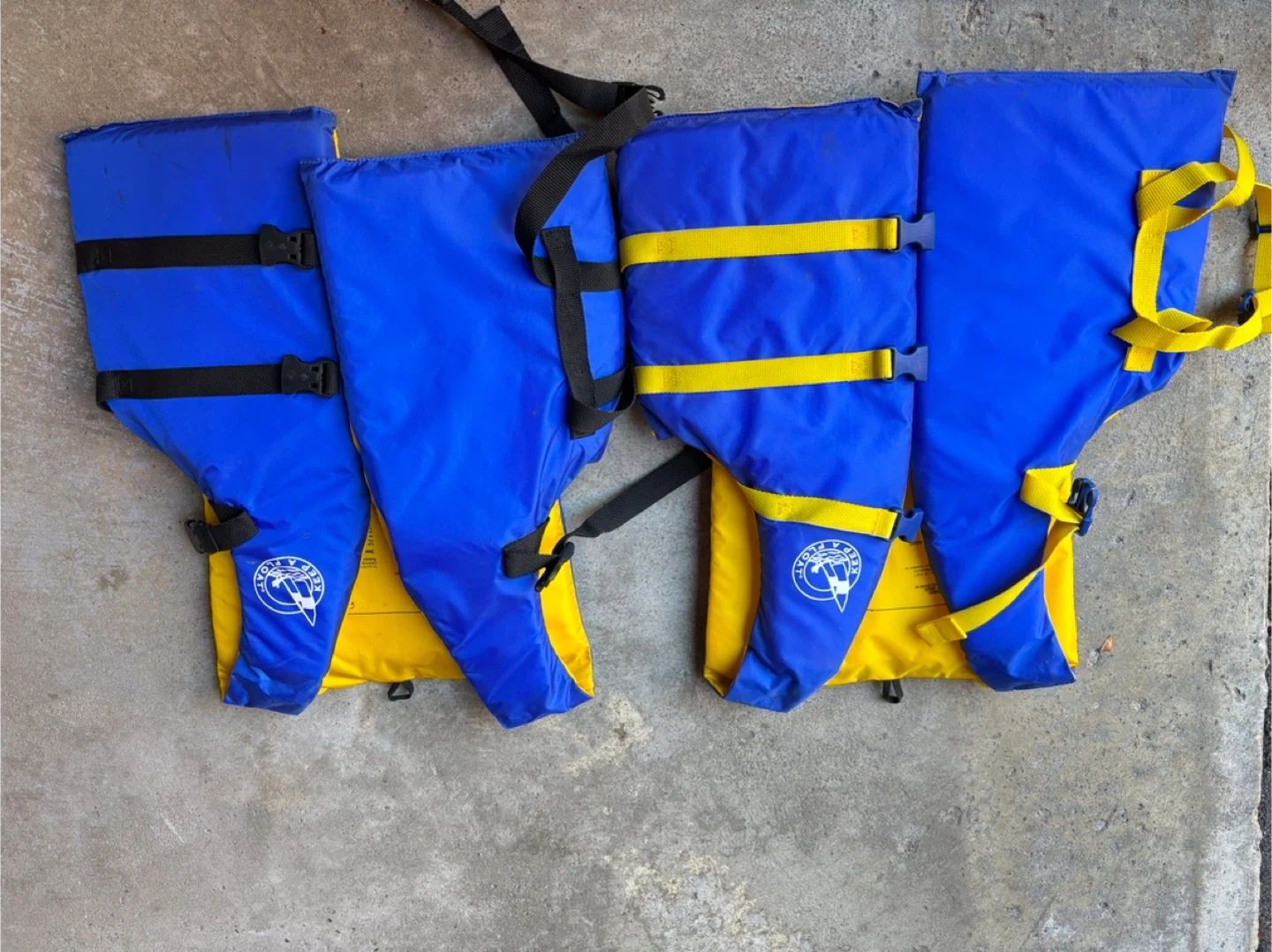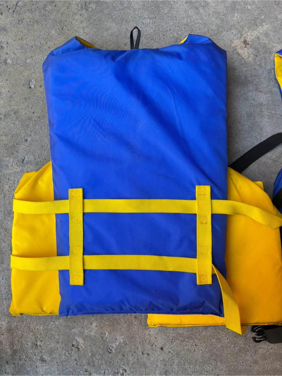Selling a pair of life jackets in blue and yellow. They are in good condition and are a universal size. Perfect for boating or any water activities! Cash only and must be able to pick up.