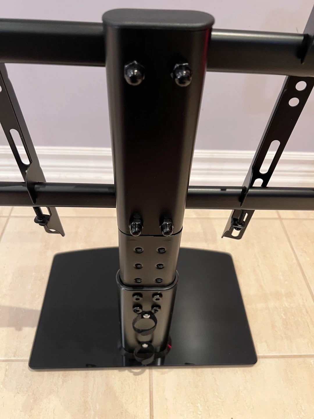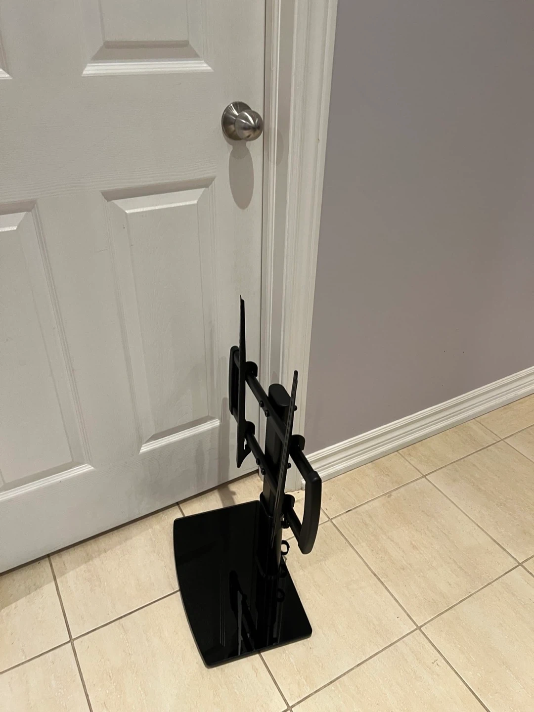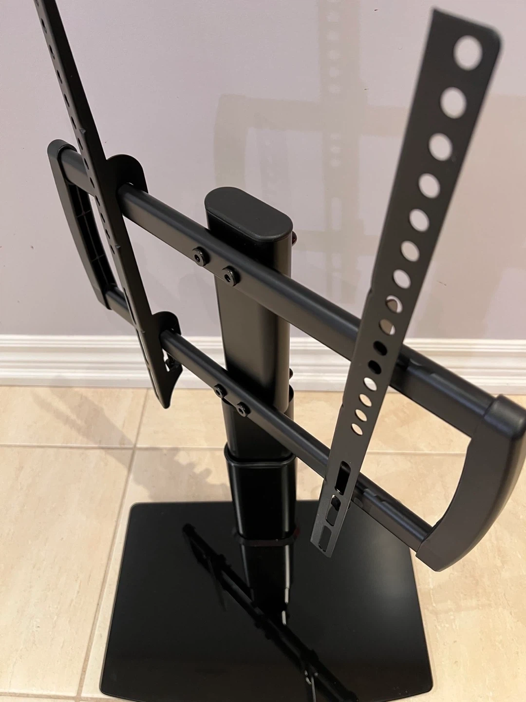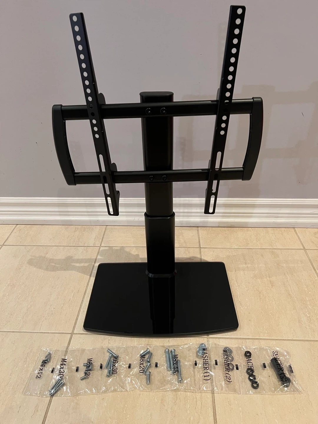 Selling a universal swivel TV stand in black! It features height adjustment, making it super versatile for different TV sizes and viewing preferences. All the necessary components and hardware are included, as shown in the pictures. It's in great condition and ready to find a new home!