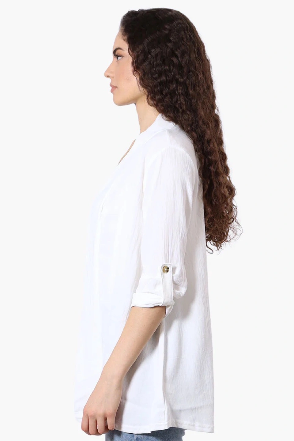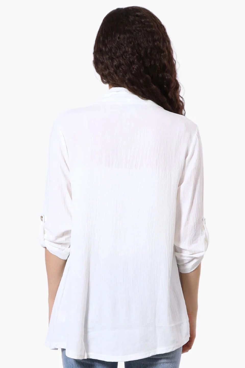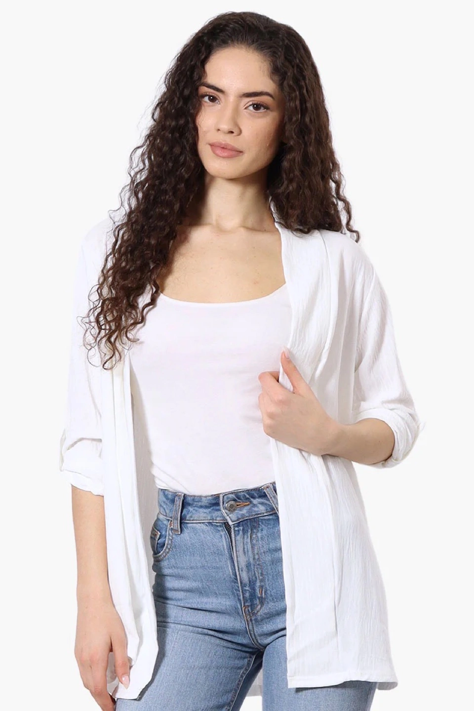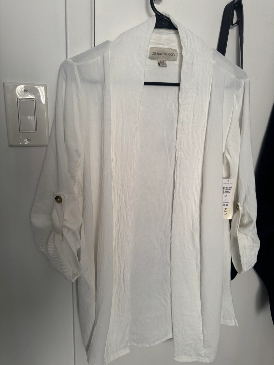 Women's white open-front cardigan. Size small. Three-quarter sleeves. Rolled cuffs with buttons. Lightweight fabric. Perfect for layering. This cardigan is brand new and completely untouched, the price tag is still on it.
