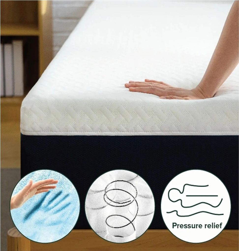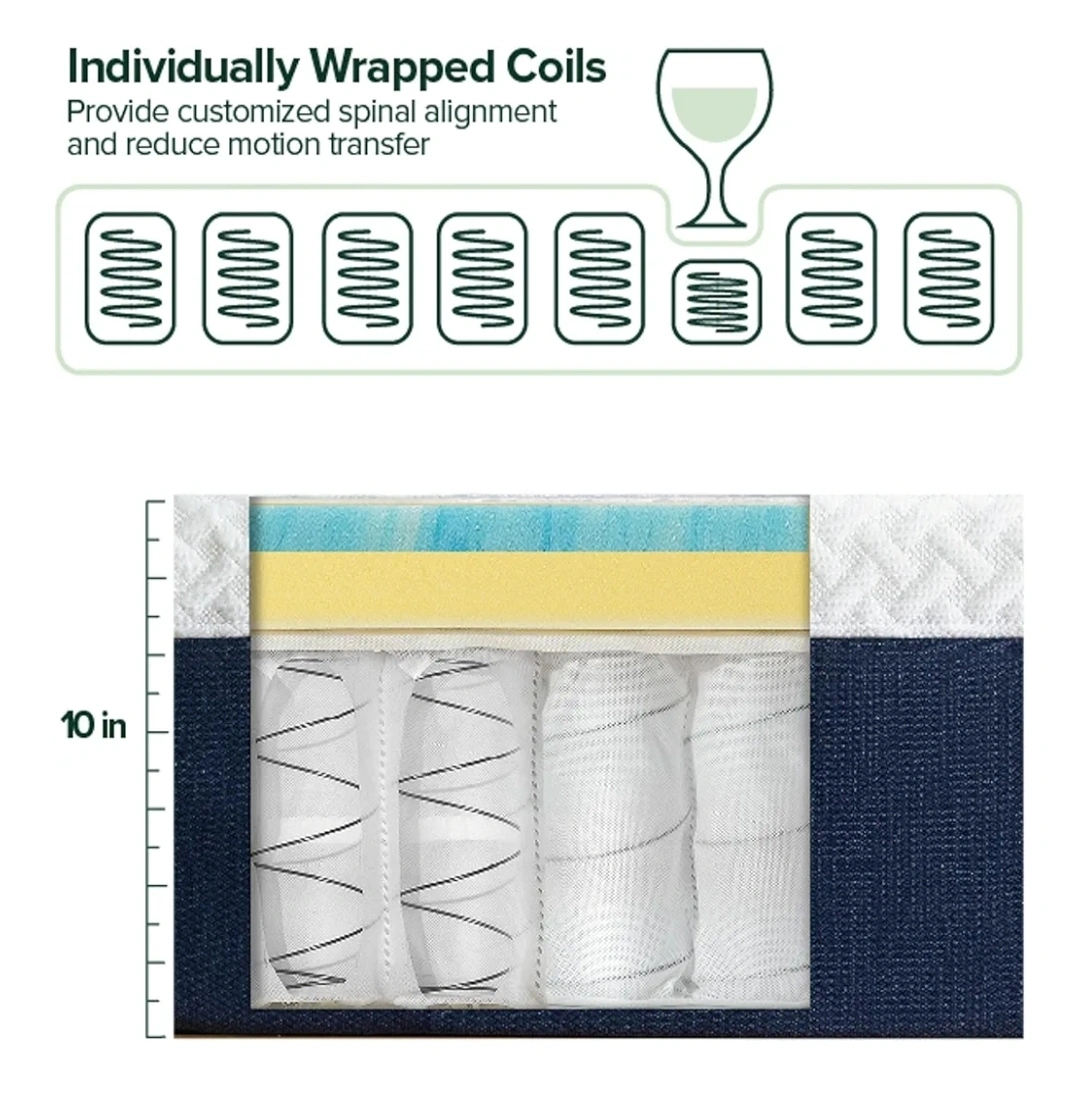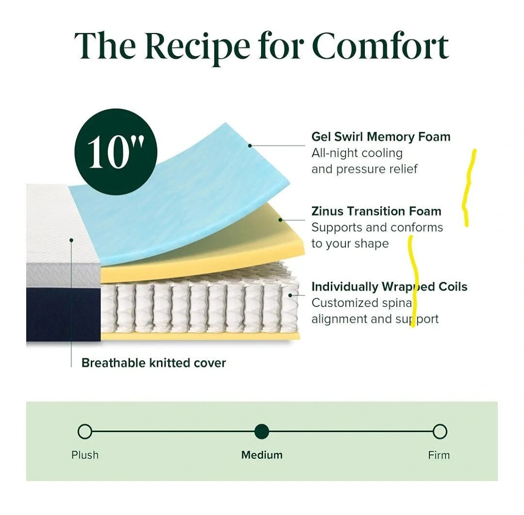 Selling a Zinus 10 Inch Cooling Comfort Hybrid Mattress. It features: - Gel Swirl Memory Foam for all-night cooling and pressure relief - Zinus Transition Foam to support and conform to your shape - Individually Wrapped Coils for customized spinal alignment and support It has a breathable knitted cover and offers a medium-firm feel. Mattress in a Box!