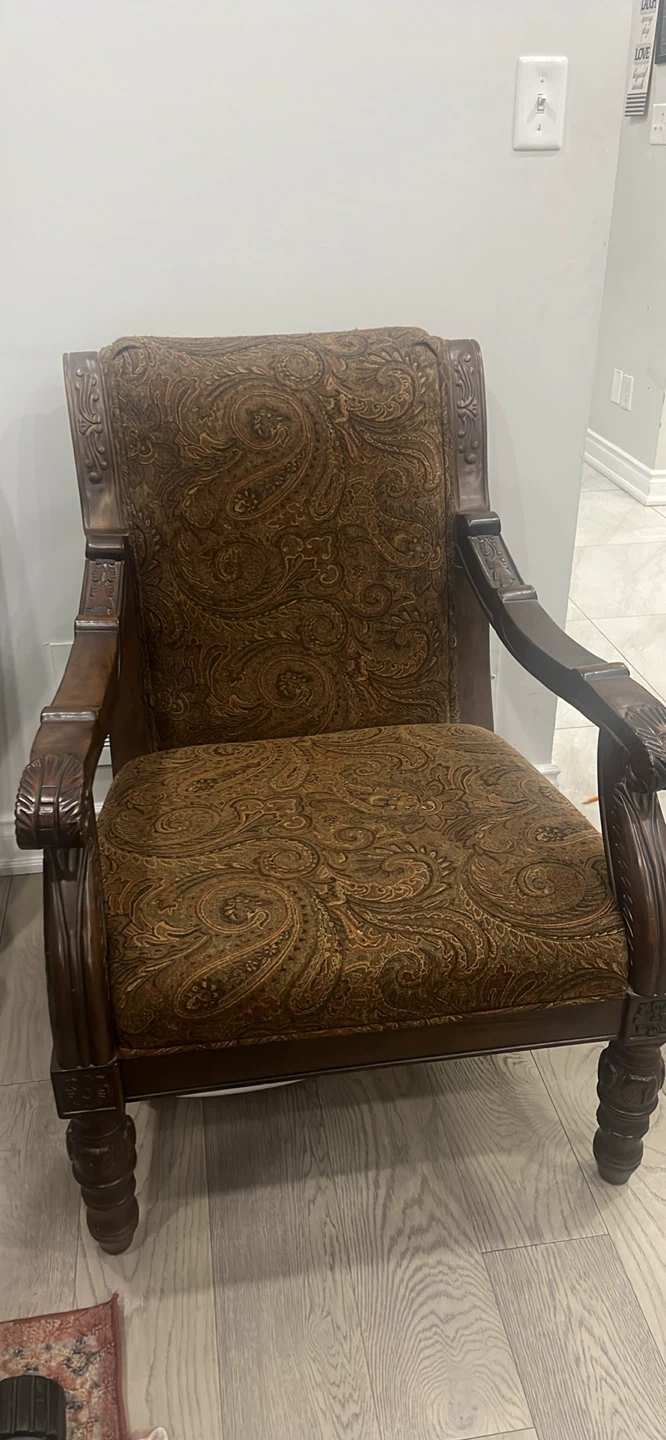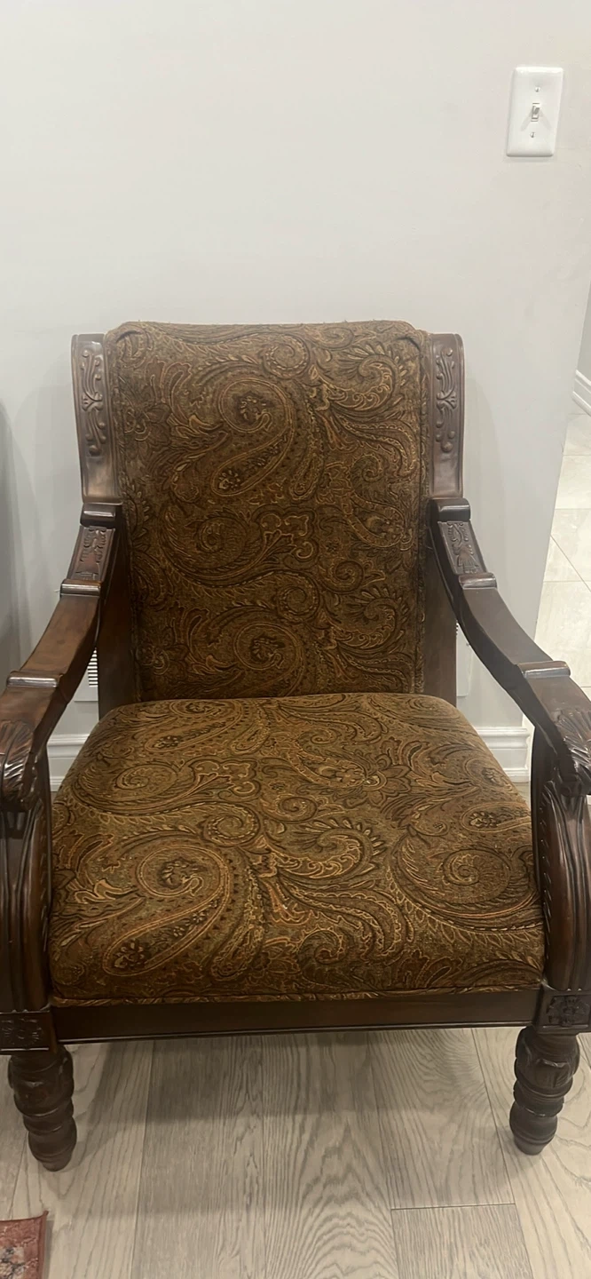 A lovely armchair with a unique brown patterned fabric. It features carved wooden armrests and a comfortable upholstered seat and back. This chair would be a great addition to any living room, bedroom or study!