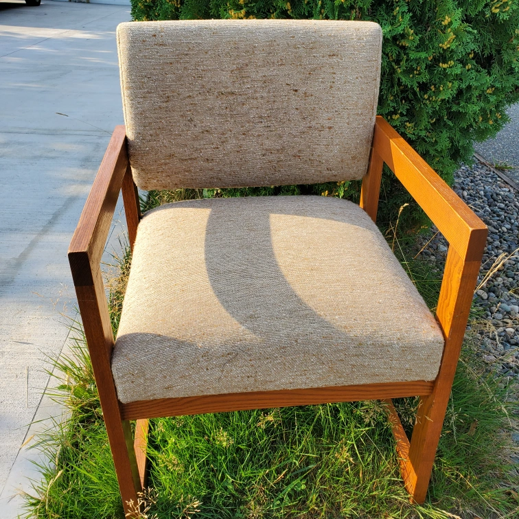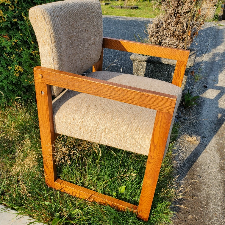 Here's a sturdy armchair with a wooden frame and upholstered seat and back. It's in good condition and ready to add some comfort to your space. Perfect for a reading nook or as an accent chair in your living room! The back tilts and needs to be screwed in... An easy fix.