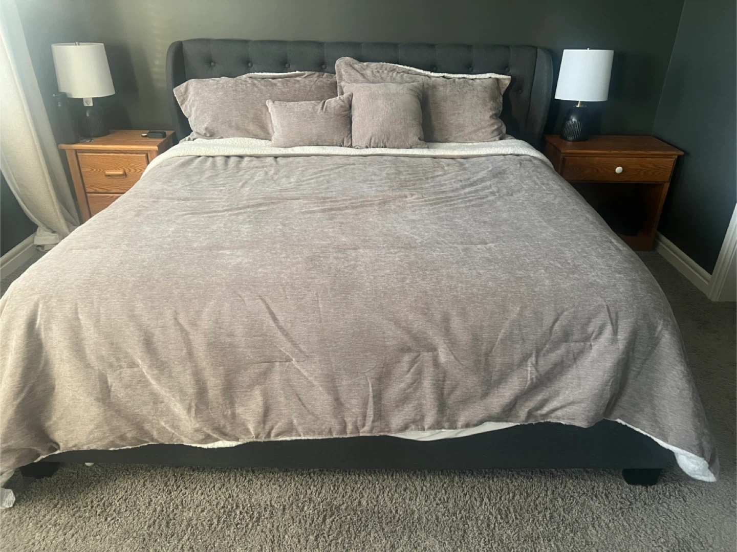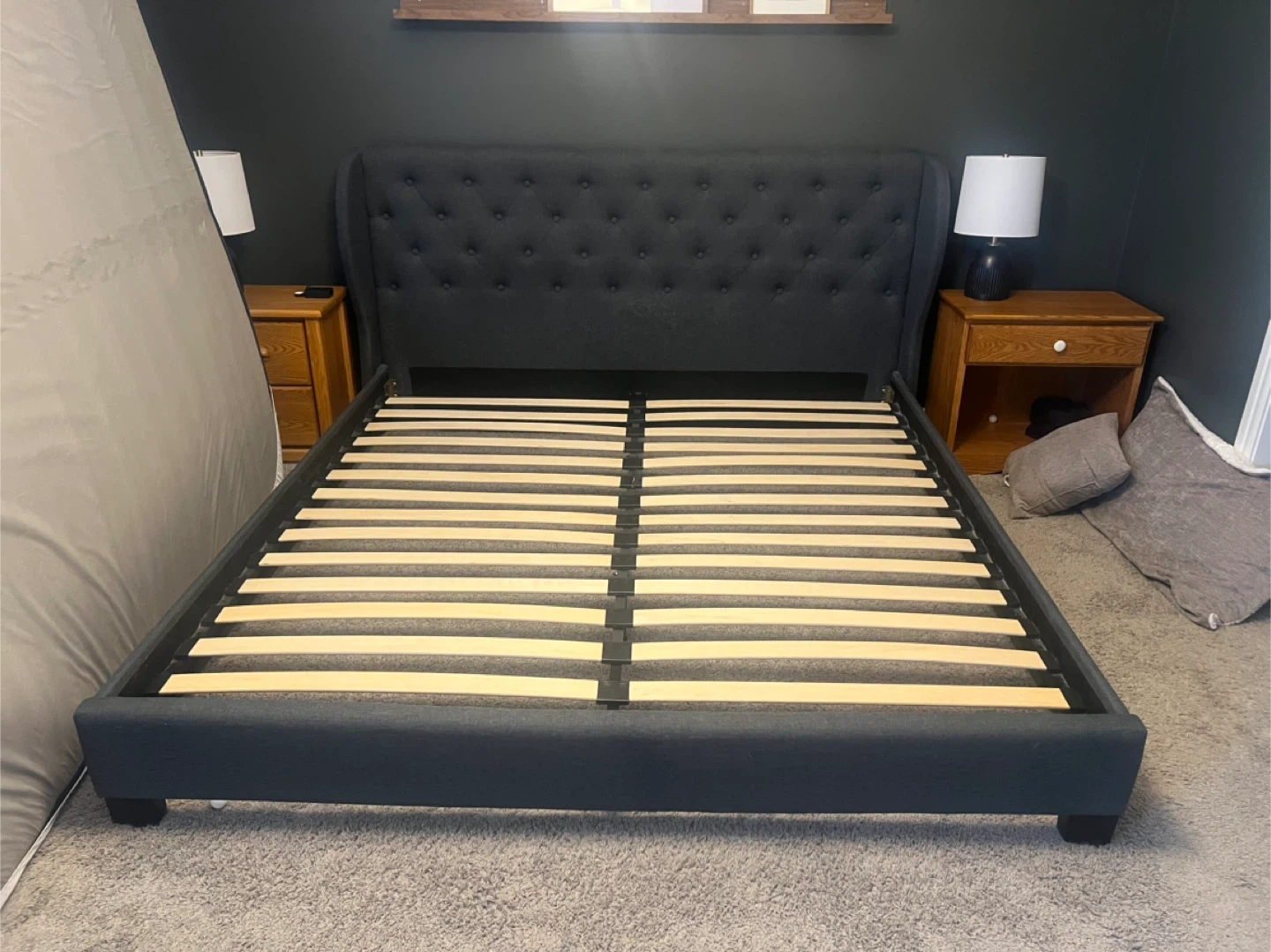 King Bed Frame – Dark Blue/Grey Stylish and sturdy king-size bed frame in a dark blue/grey fabric. From a dog-friendly home. One slat support piece has a minor crack (the slat itself is intact), and the center support bar is slightly bent, but neither issue has affected the bed’s stability or performance. Overall, it’s in good used condition and has plenty of life left.