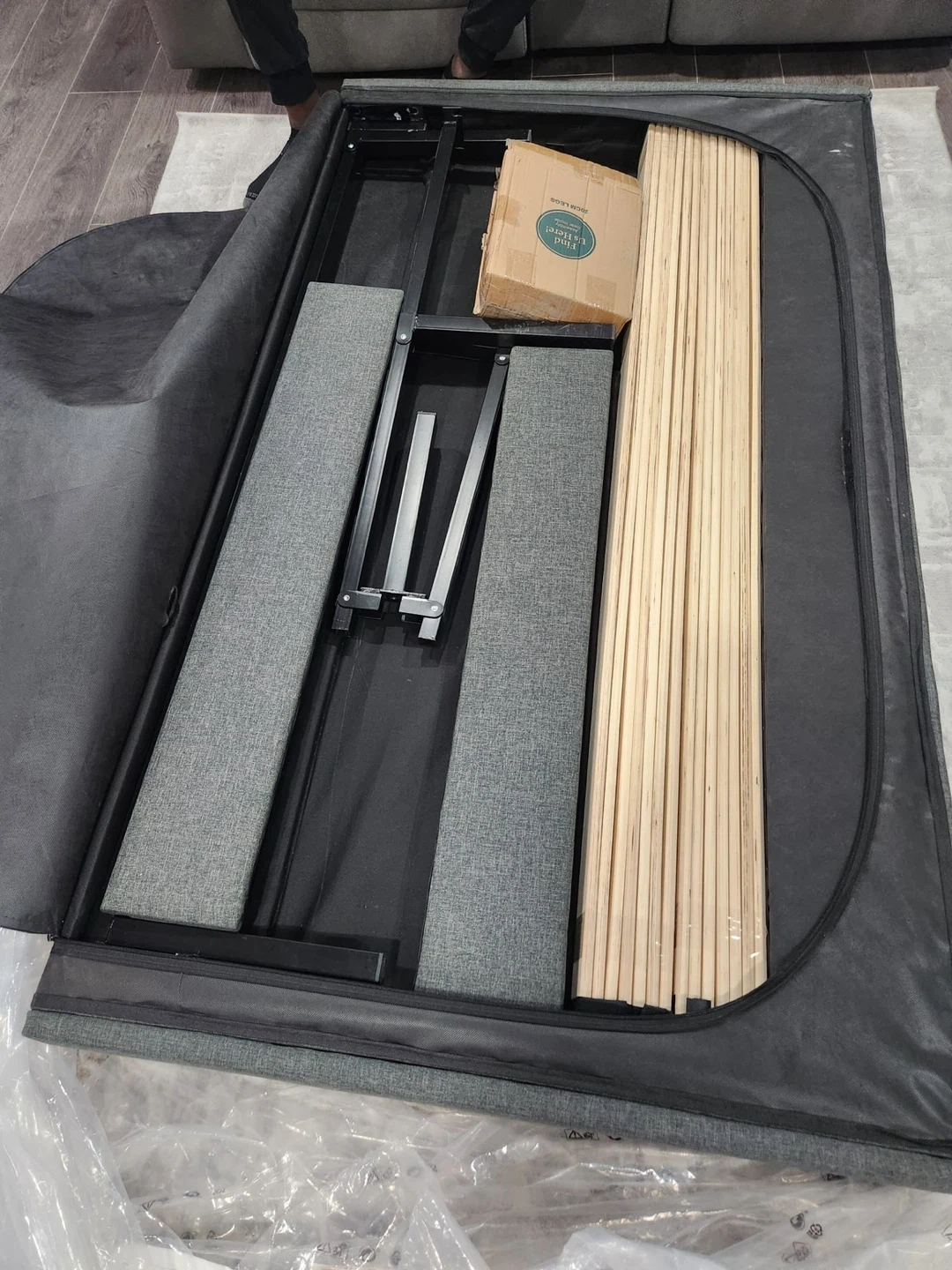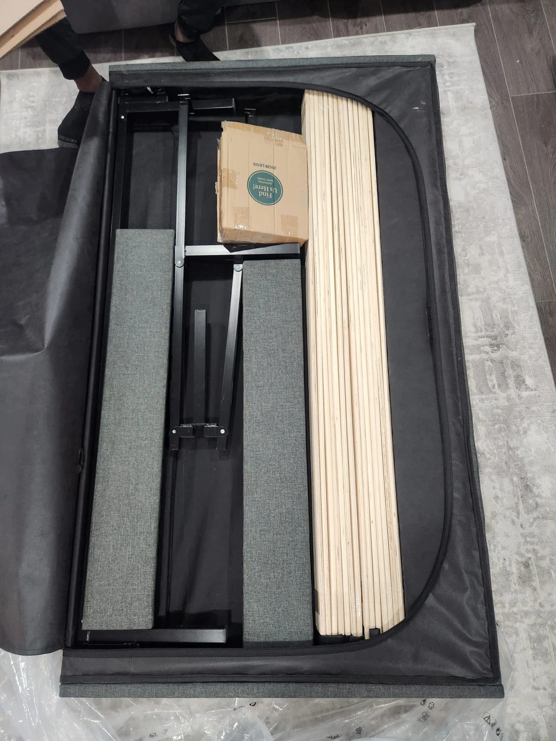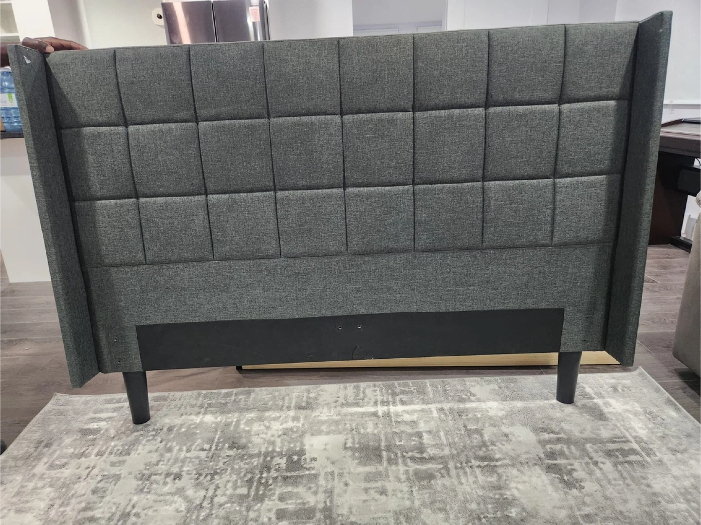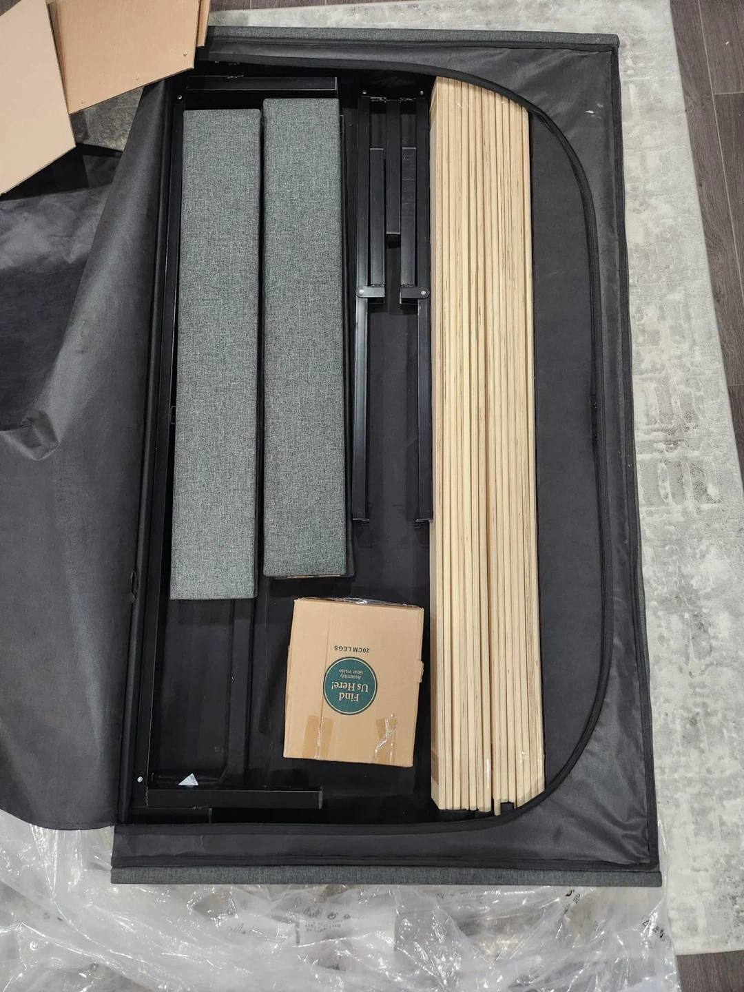 Selling a bed frame with a headboard! It's upholstered in a nice grey fabric. All the pieces are included, like the wooden slats and the metal frame. It's all packed up and ready to go!