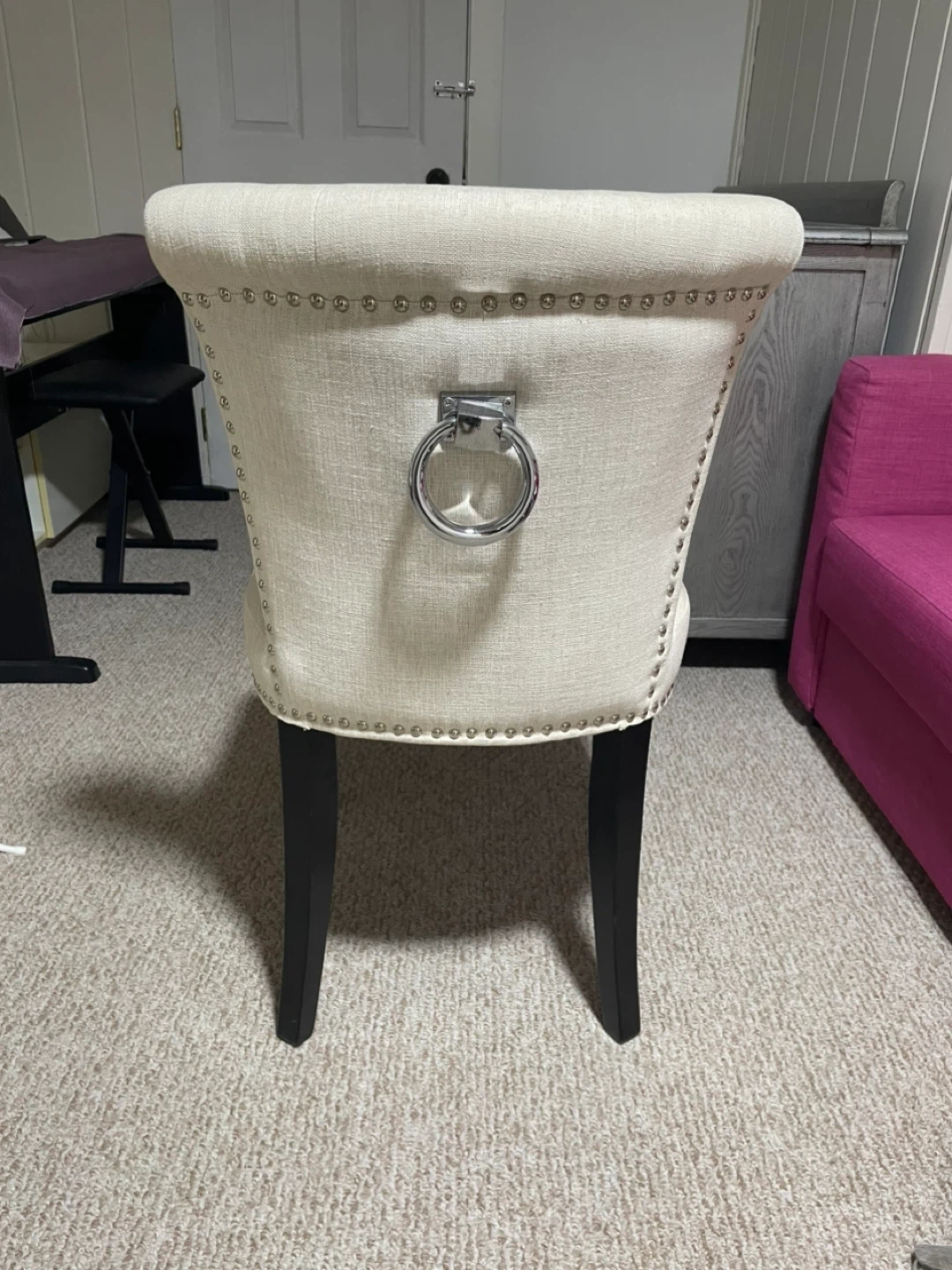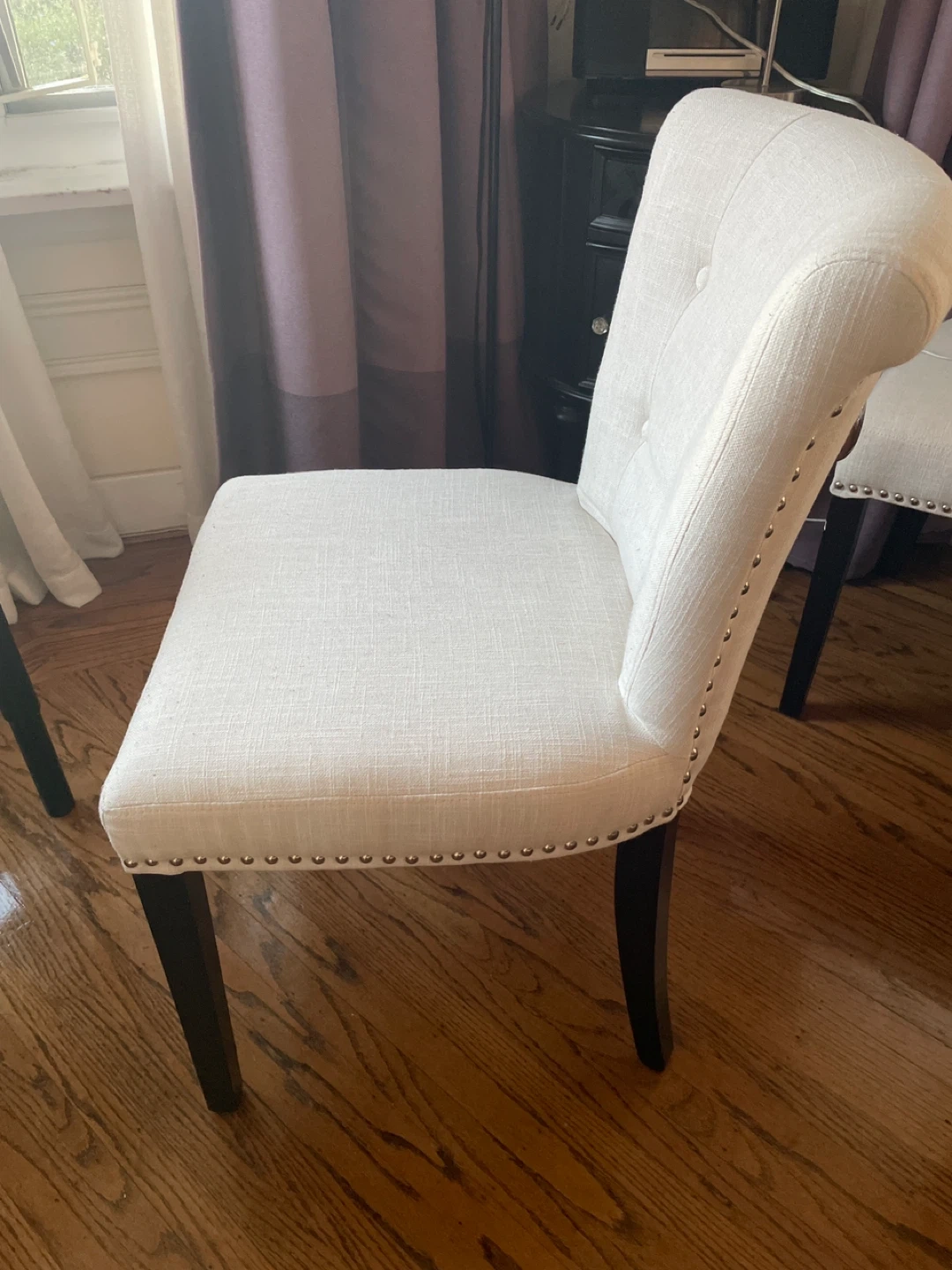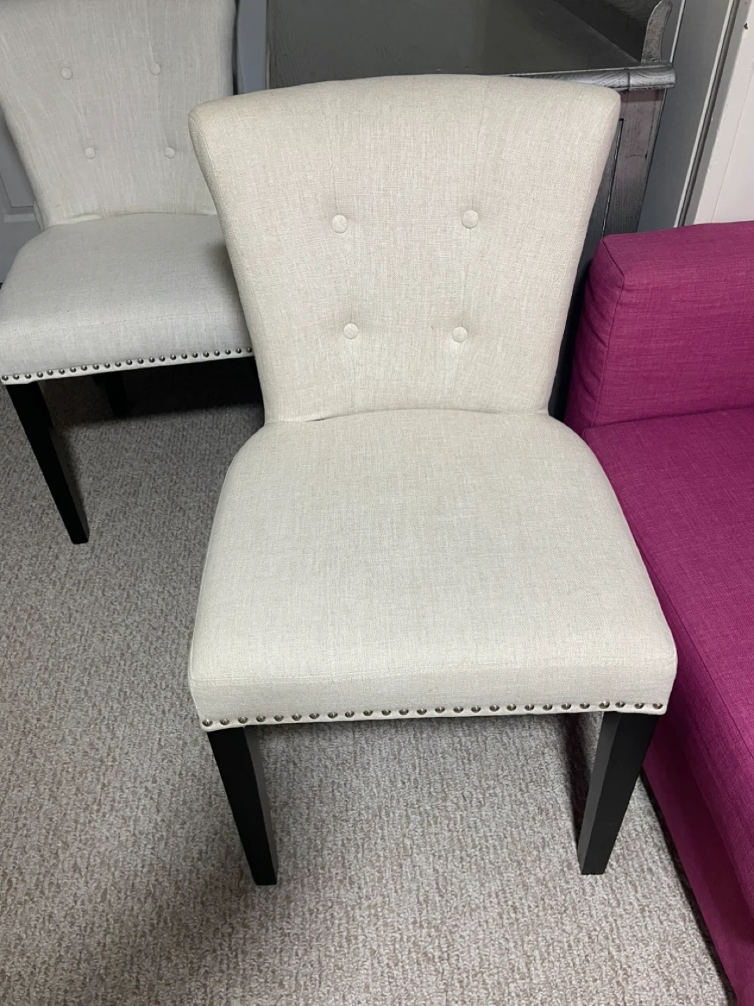 Selling a lovely upholstered dining chair. It features a neutral fabric with nailhead trim, adding a touch of elegance to any dining space. The chair has a classic design with a button-tufted back. Perfect for adding extra seating to your dining room or kitchen! Rarely use, just like new. Total 6 of these, $50/each, or $280 for all.