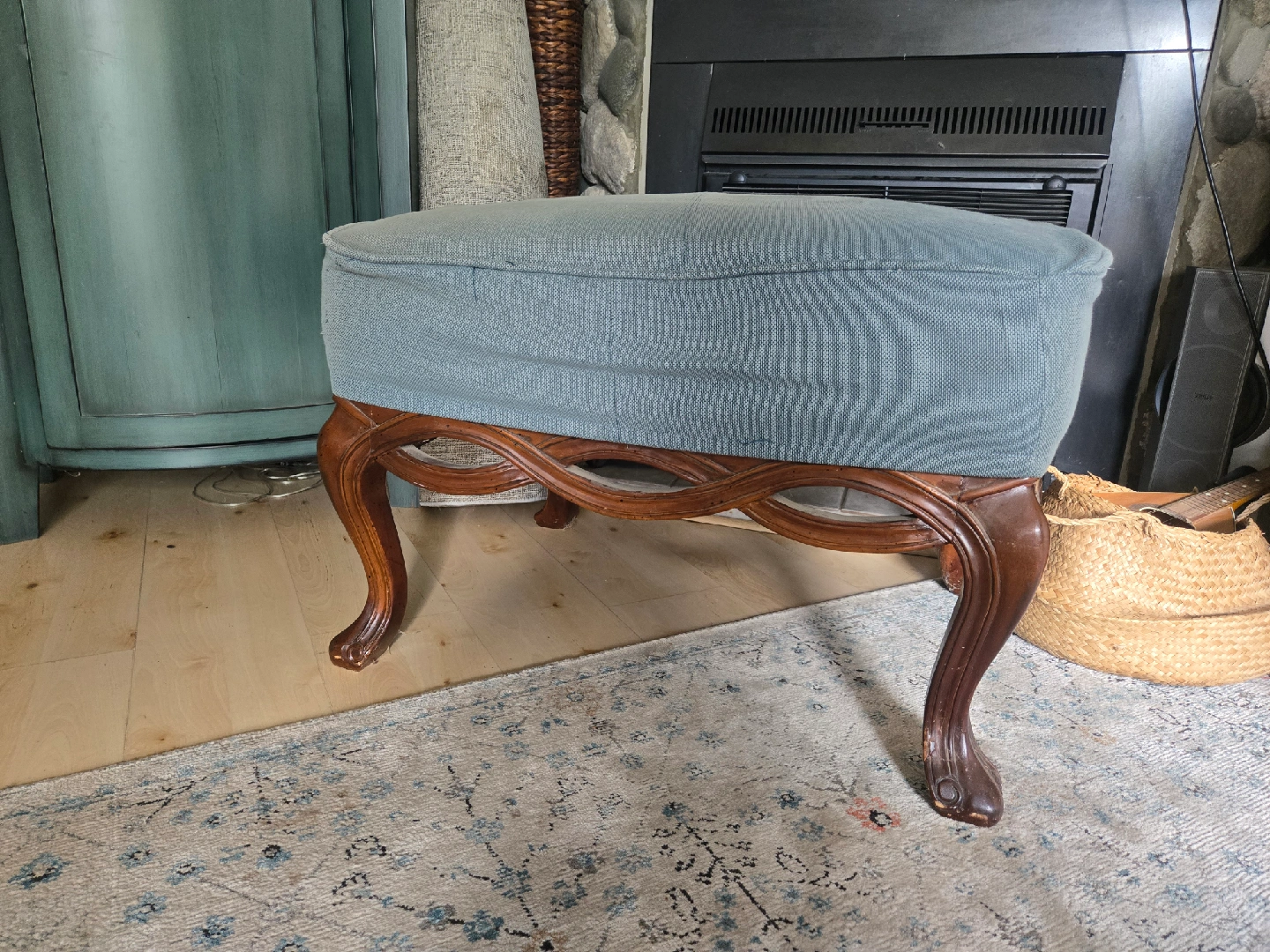 Selling a cute upholstered ottoman footstool. It has a wooden frame with curved legs and a padded top. The top is upholstered in a patterned brown fabric. It also has a blue cover, if you'd like a different look. It would be a great addition to any living room or bedroom!
