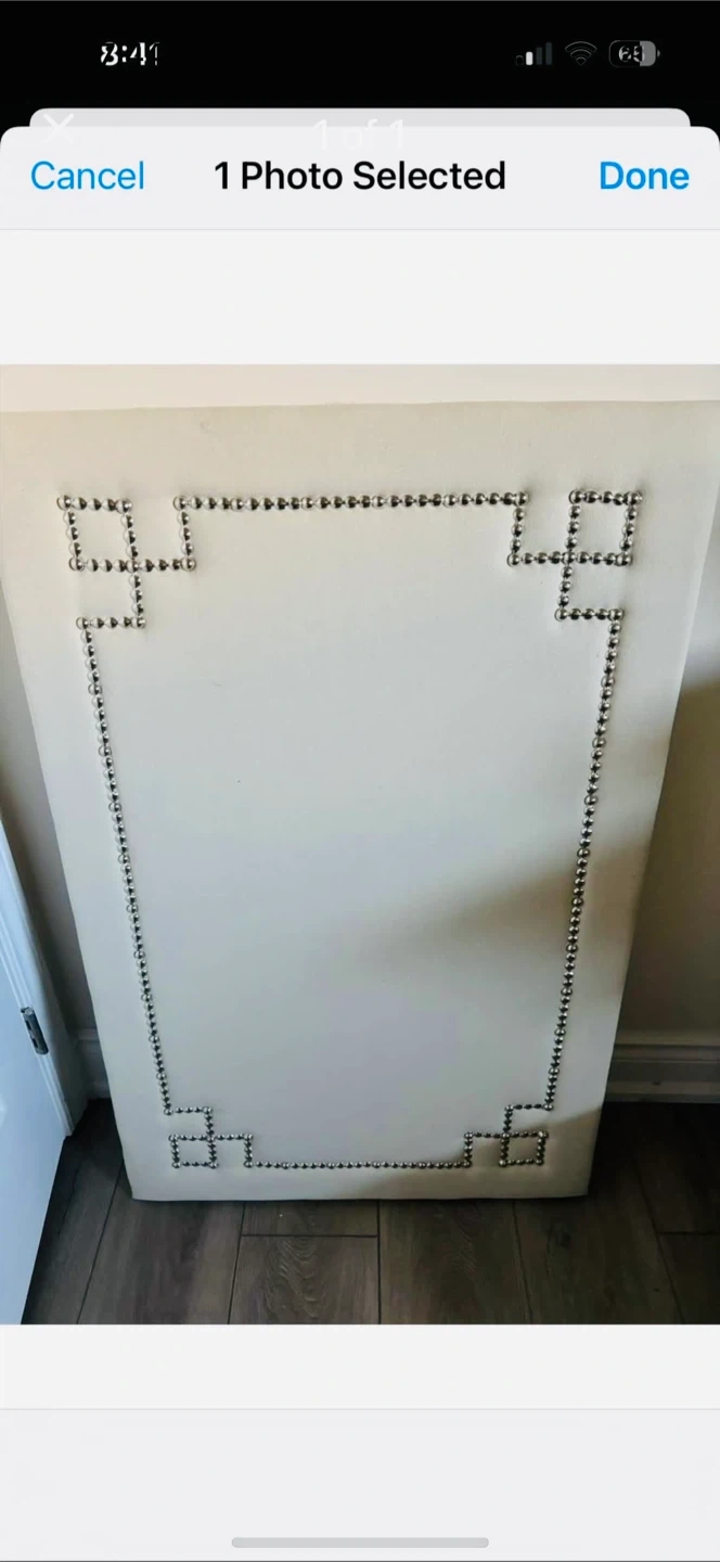 Selling a stylish upholstered headboard featuring nailhead trim. It's in great condition and would add a touch of elegance to any bedroom. The colour is a neutral cream or off-white.
