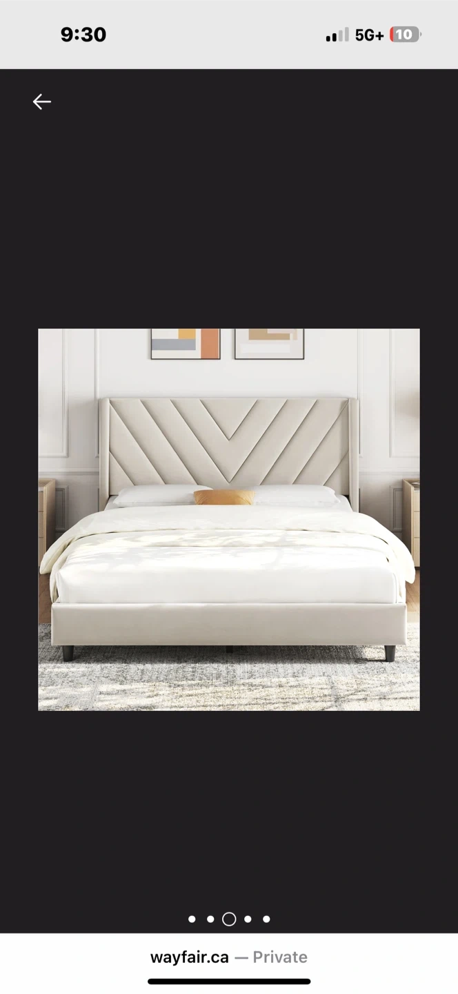 Selling a stylish upholstered platform bed with a unique chevron-patterned headboard! It's in great condition and would look lovely in any bedroom. The bed frame features a neutral colour that complements various decor styles