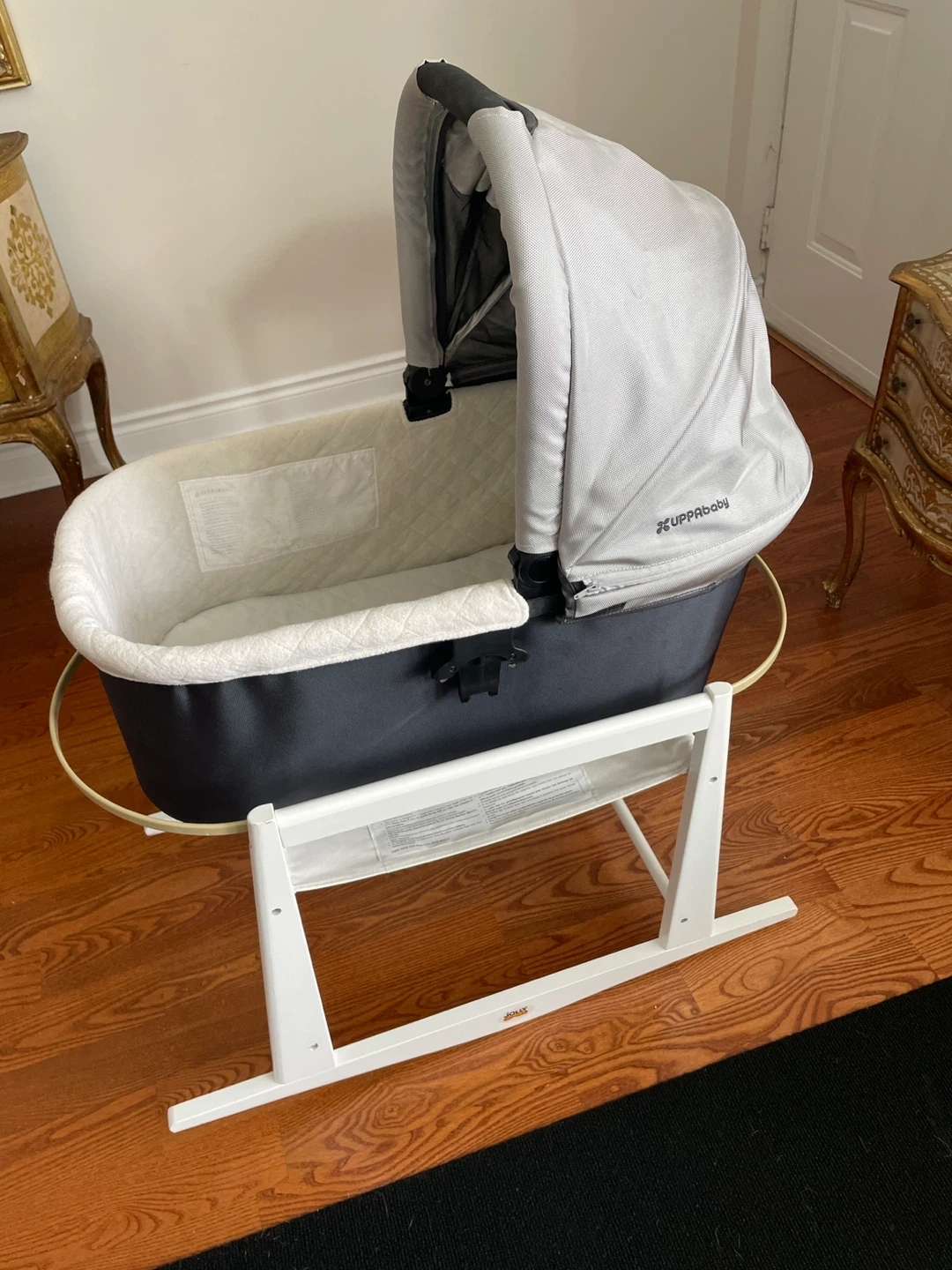 Selling a gently used UPPAbaby bassinet with jolly jumper It's in good condition and ready for a new little one. Perfect for newborns, this bassinet provides a cozy and safe sleeping space. I will sell it the Bassinet and Jolly Jumper separately .