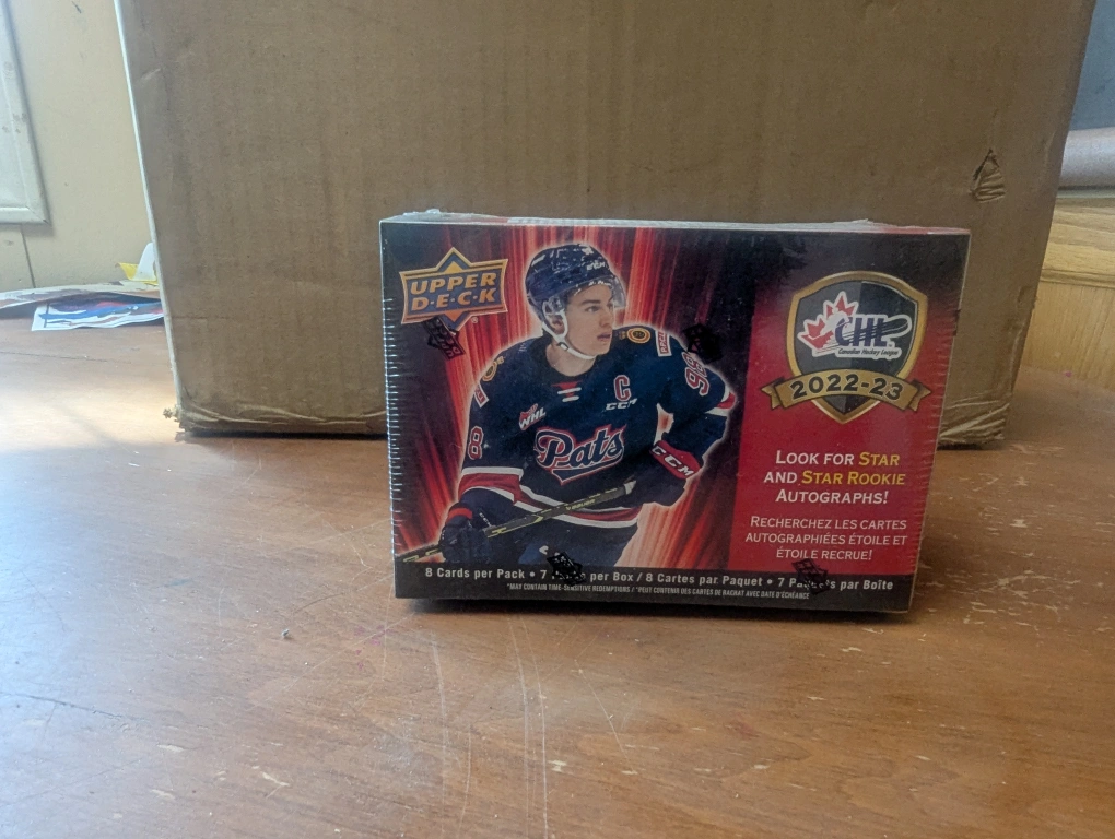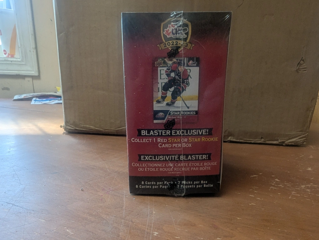 I'm selling a brand new, sealed box of Upper Deck CHL 2022-23 hockey cards! This blaster exclusive box includes 8 cards per pack and 7 packs per box. Look for star and star rookie autographs and collect 1 red star or rookie card per box!