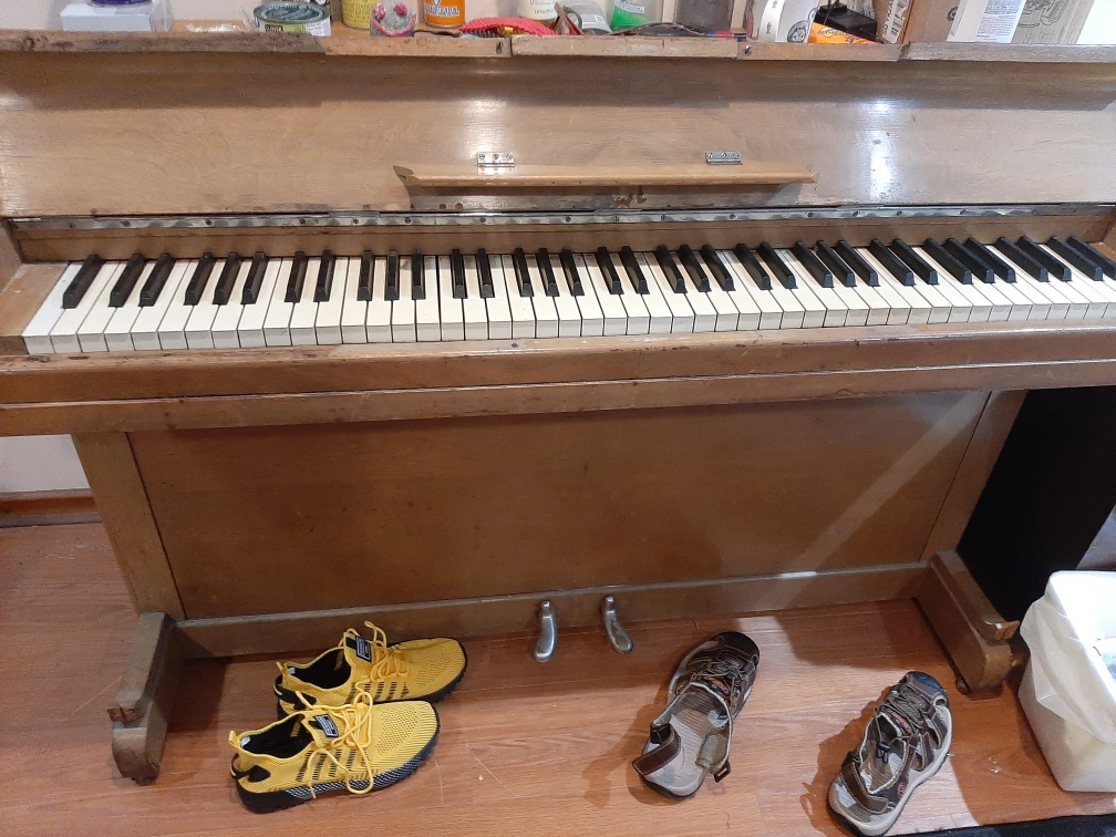 Selling an upright piano. It has a wooden finish and is in used condition. Perfect for someone looking to learn or practice! or place items on.