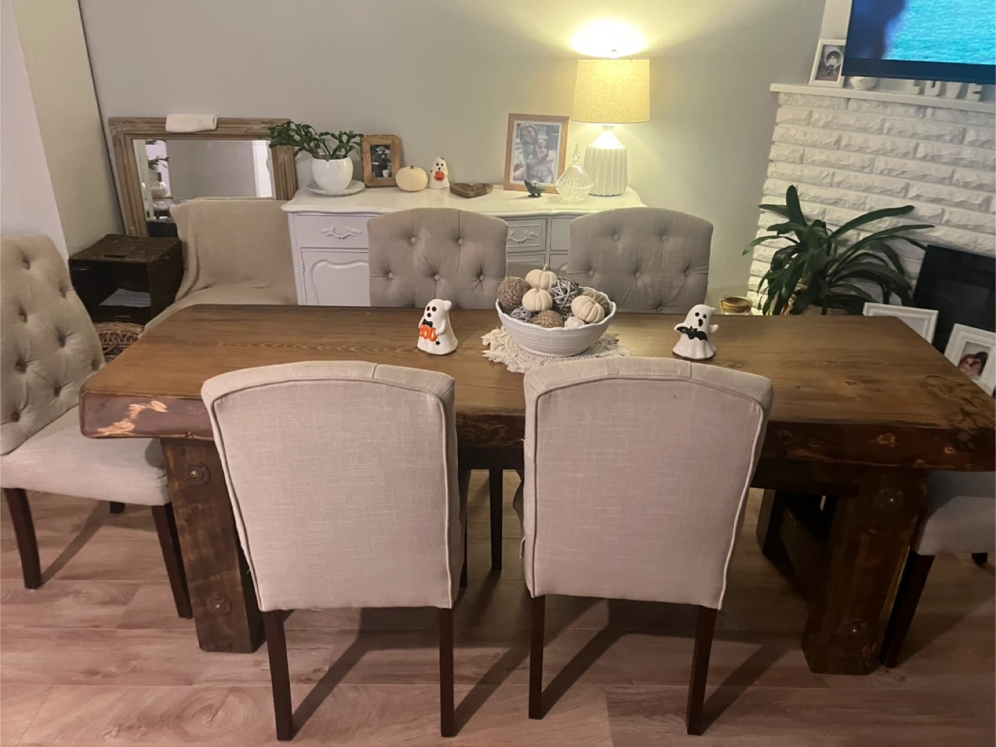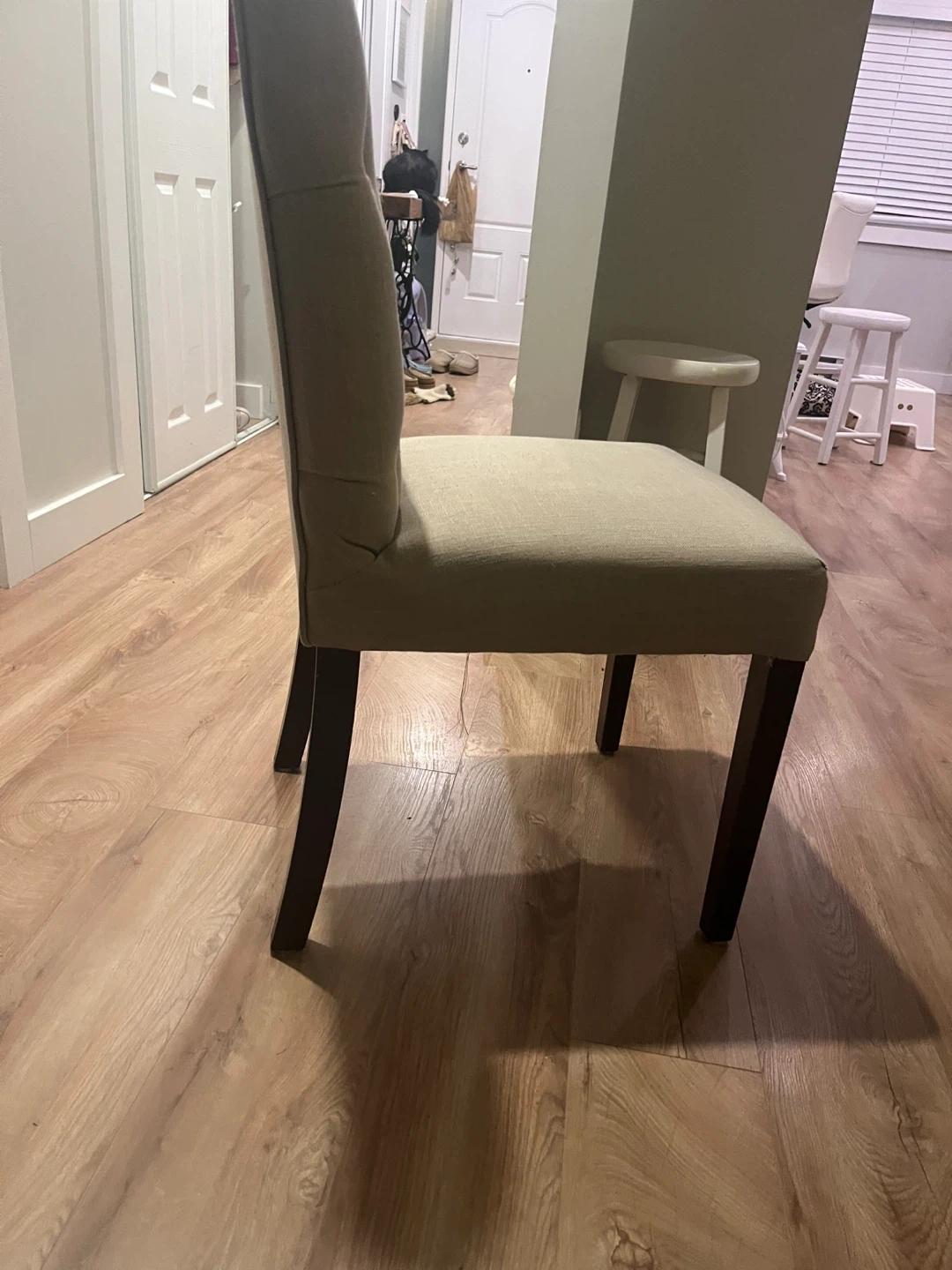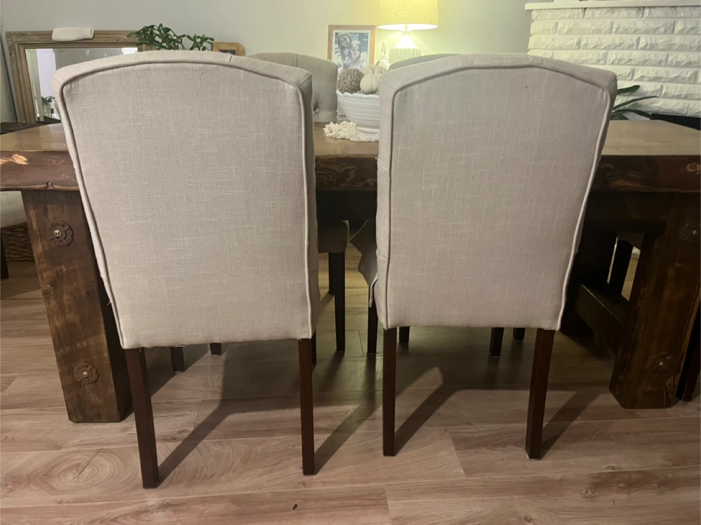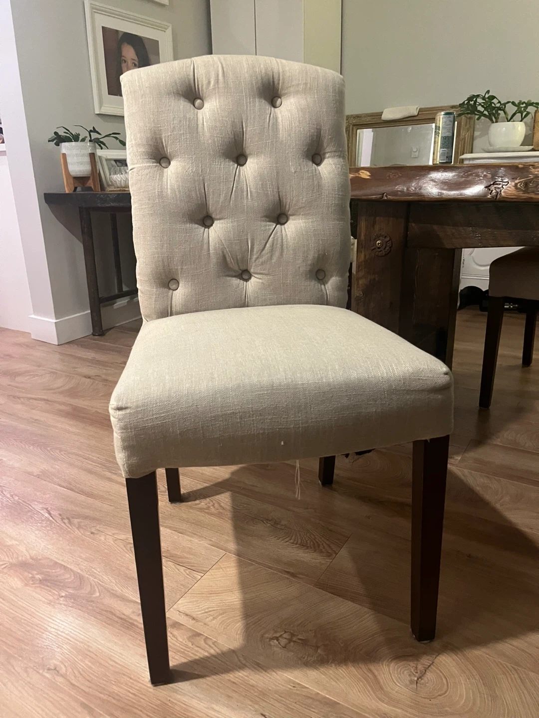 Selling a set of six upholstered dining chairs. They're in great shape and would look lovely in any dining room! The chairs have a neutral colour that would match most tables.