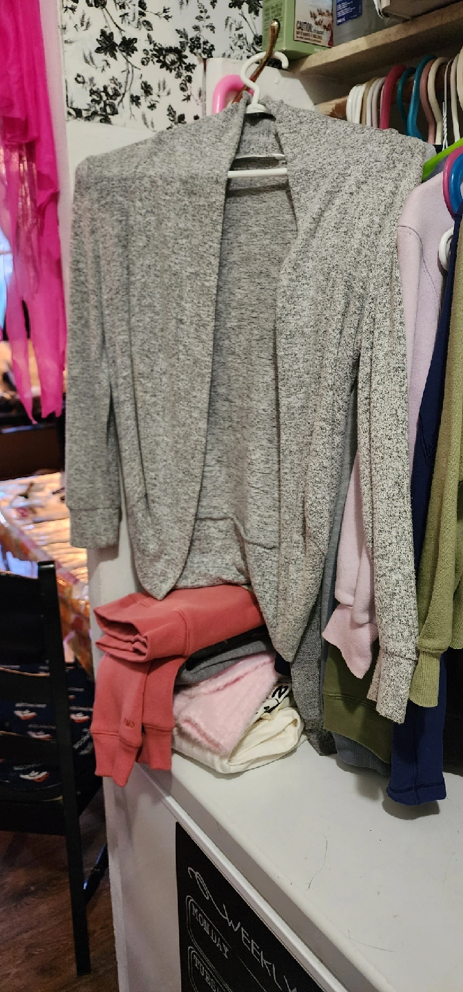 Selling a grey open cardigan. It's in great condition and perfect for layering! The material is soft and comfortable, making it ideal for everyday wear