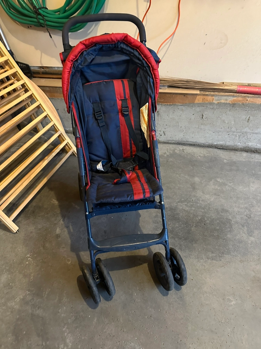 Compact stroller, navy blue and red. Suitable for infants and toddlers. Shows some wear from use.