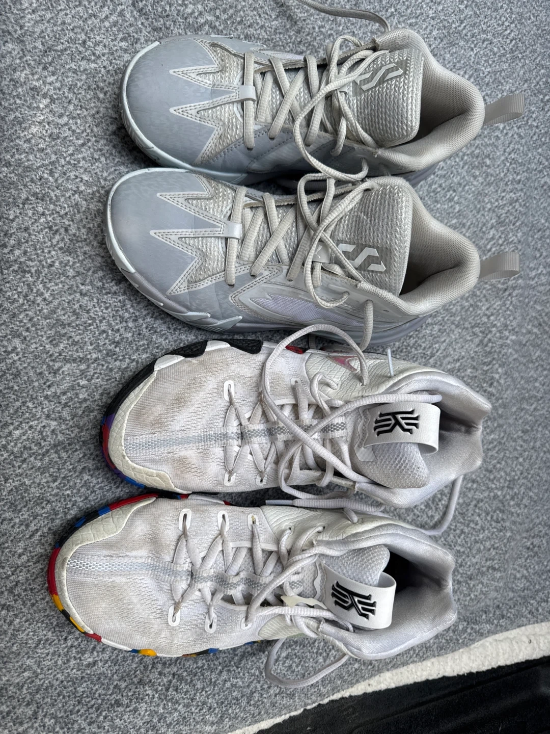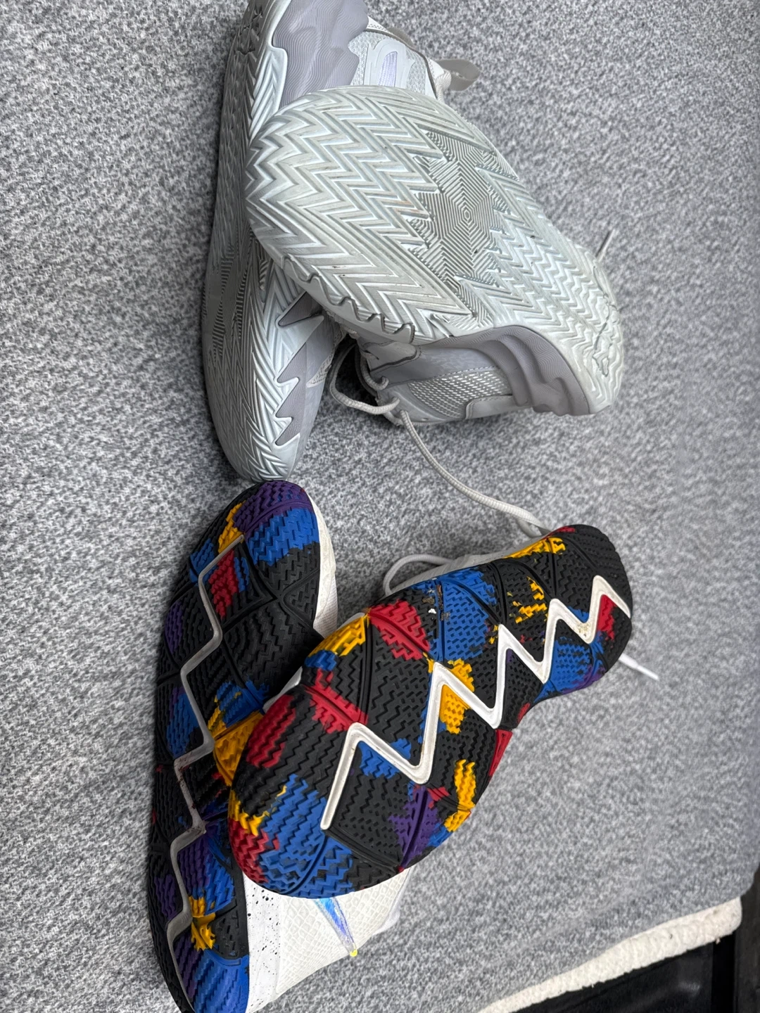 Selling two pairs of used basketball shoes. One pair is grey and the other is white with a colourful sole. Pumas are size 4Y US and the Nikes are size 6Y US. They are used but are still in good condition for playing ball! Soles hardly worn.