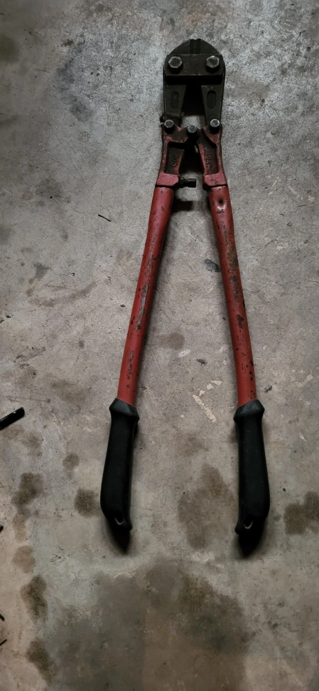 Selling a pair of bolt cutters. They're red with black handles and show some signs of use.