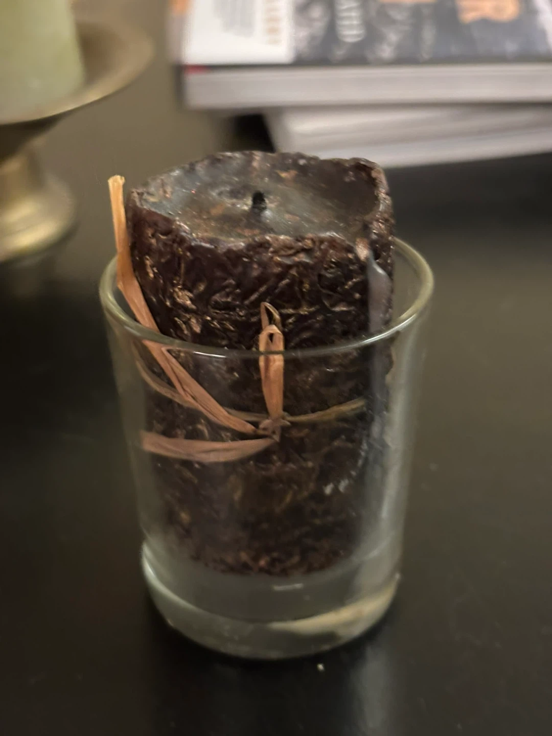 A used brown candle in a glass holder. It has some decorative straw tied around it. Perfect for creating a cozy atmosphere!