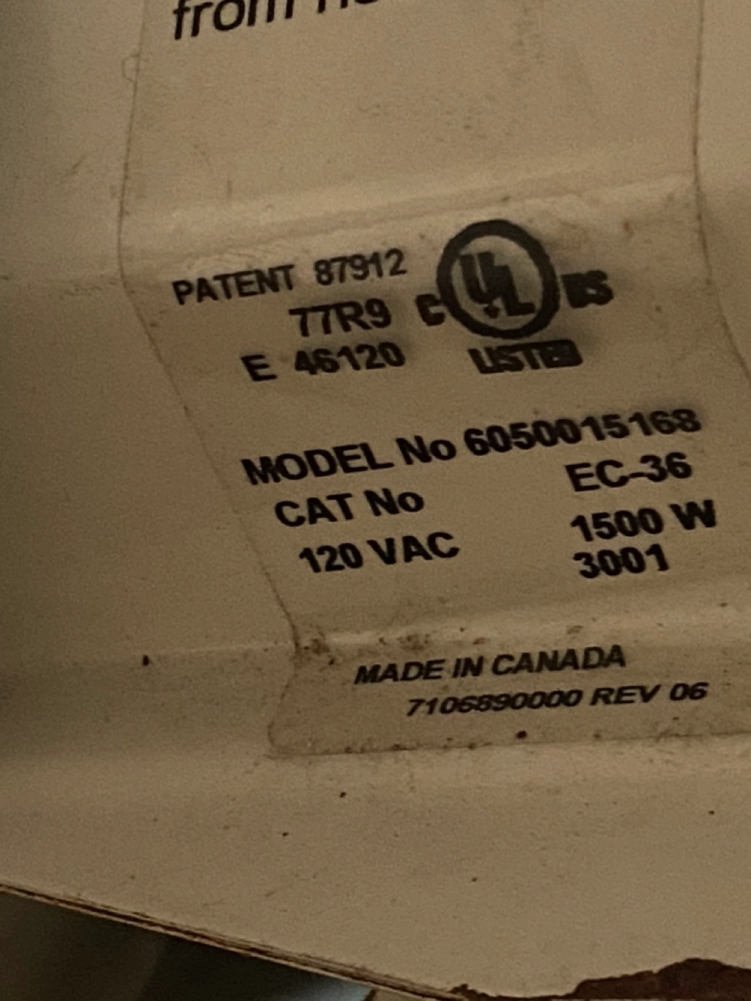 Show allCadet baseboard heater. Model No 6050015168. 1500W, 120VAC. About 35” long. Shows some wear. We’re in Waasis, but go into Fredericton often if that helps.