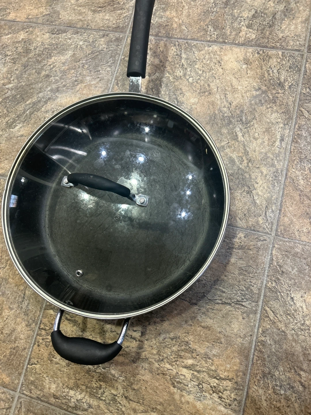 Selling a used frying pan with a lid. It has some scratches from use, but is still functional. Great for everyday cooking!