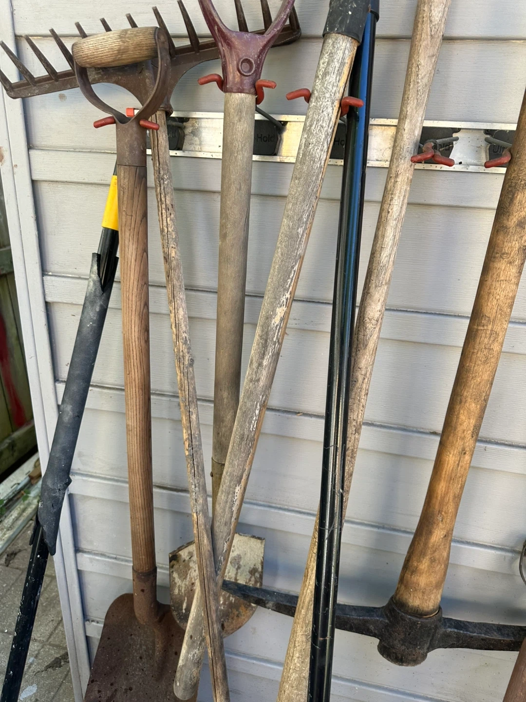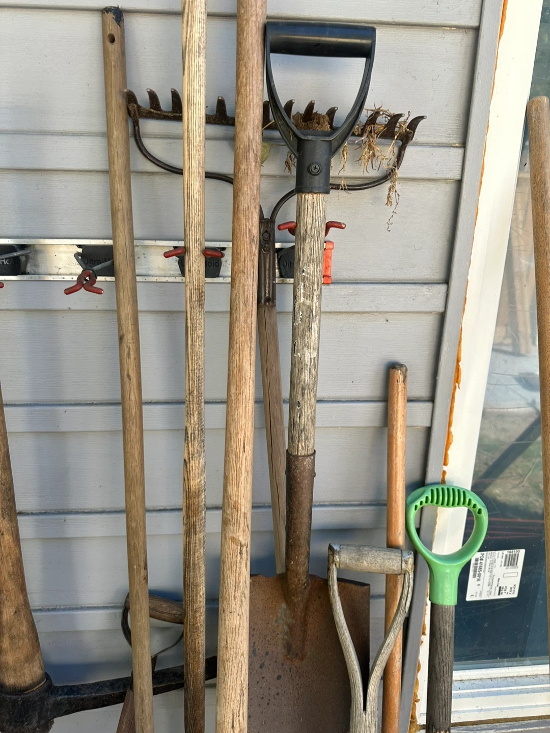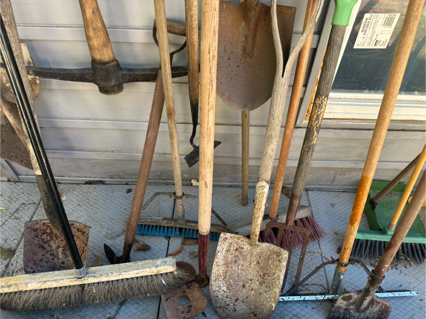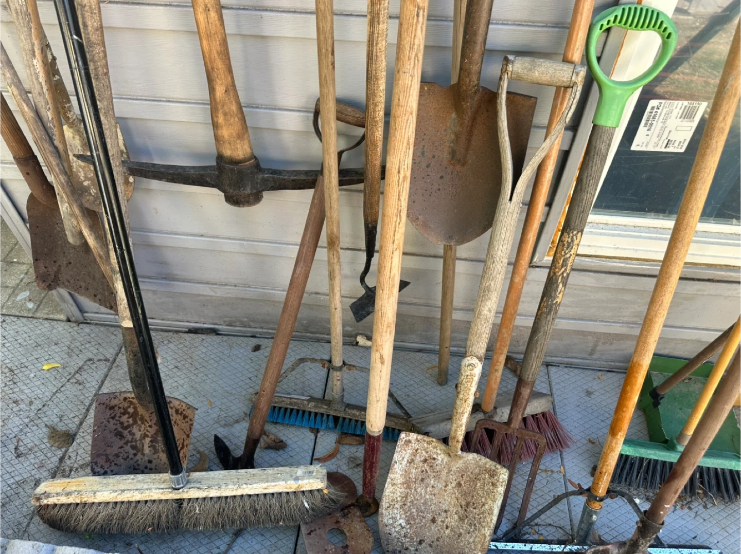 A collection of used garden tools including shovels, rakes, and brushes. They show signs of wear and rust from use, but they're still functional for various gardening tasks. Perfect for someone looking to start or expand their garden tool collection without paying full price!