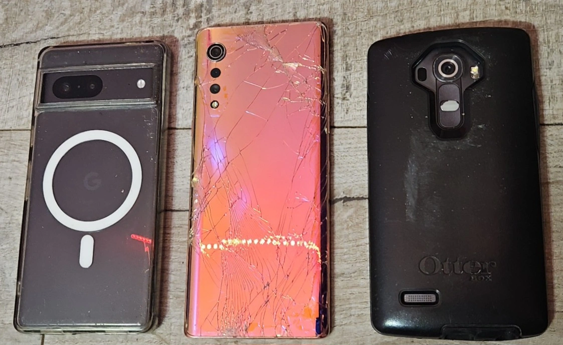 Selling a few used phones. There's a Google Pixel 7a, an LG Velvet with a cracked back, and an LG G4 in an Otterbox case. All phones are in various condition good to fix or for parts..