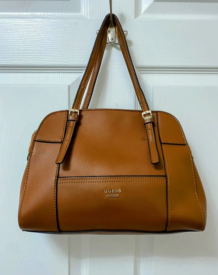 **Please note that this item is in used condition, with some wear and tear on the handles as shown in the pictures. The handles can be repaired through services such as Love Your Leather in Toronto.** Check out this stylish, chestnut-brown Guess satchel handbag, perfect for adding a touch of elegance to any outfit. It features a spacious interior with multiple compartments to keep your essentials organized. *Brand: Guess *Model: Huntley cali satchel *Colour: Chestnut-brown *Style: Satchel handbag *Material: Faux leather *Hardware: Gold-tone If the ad is up, it's available! Pickup in Scarborough. Cash only.