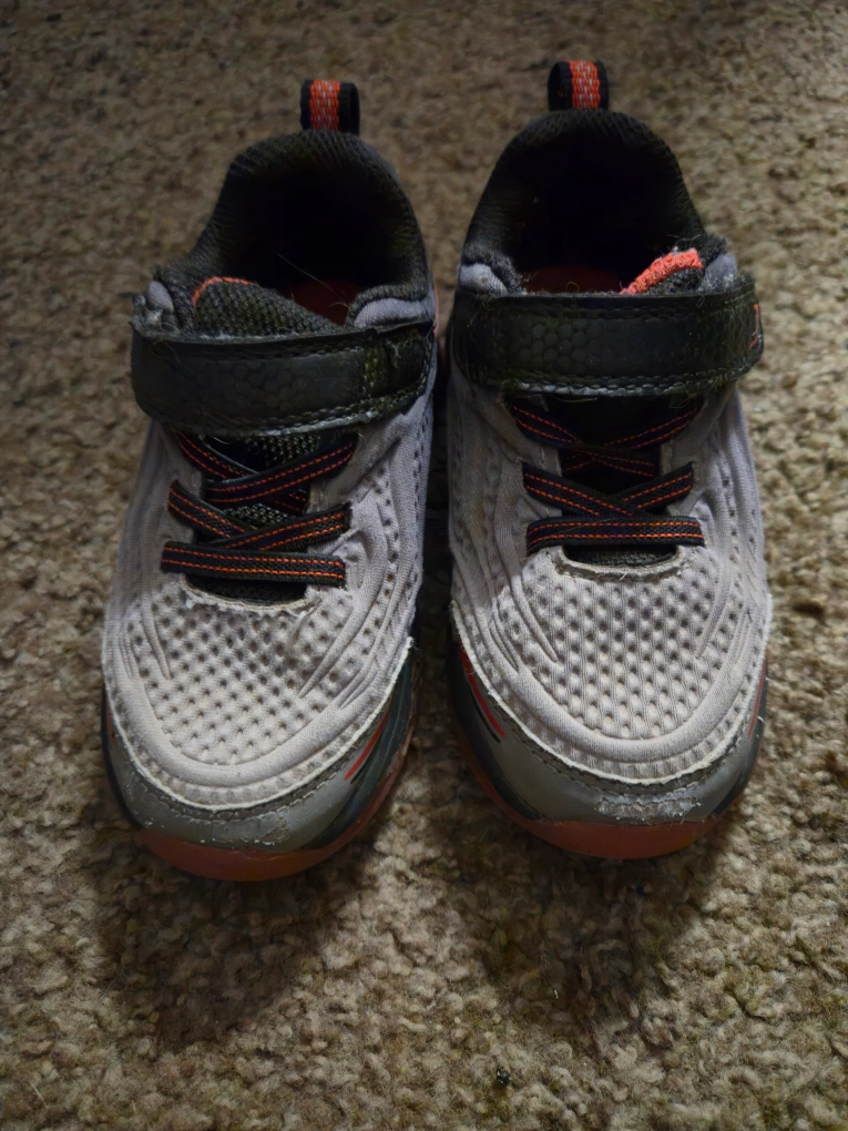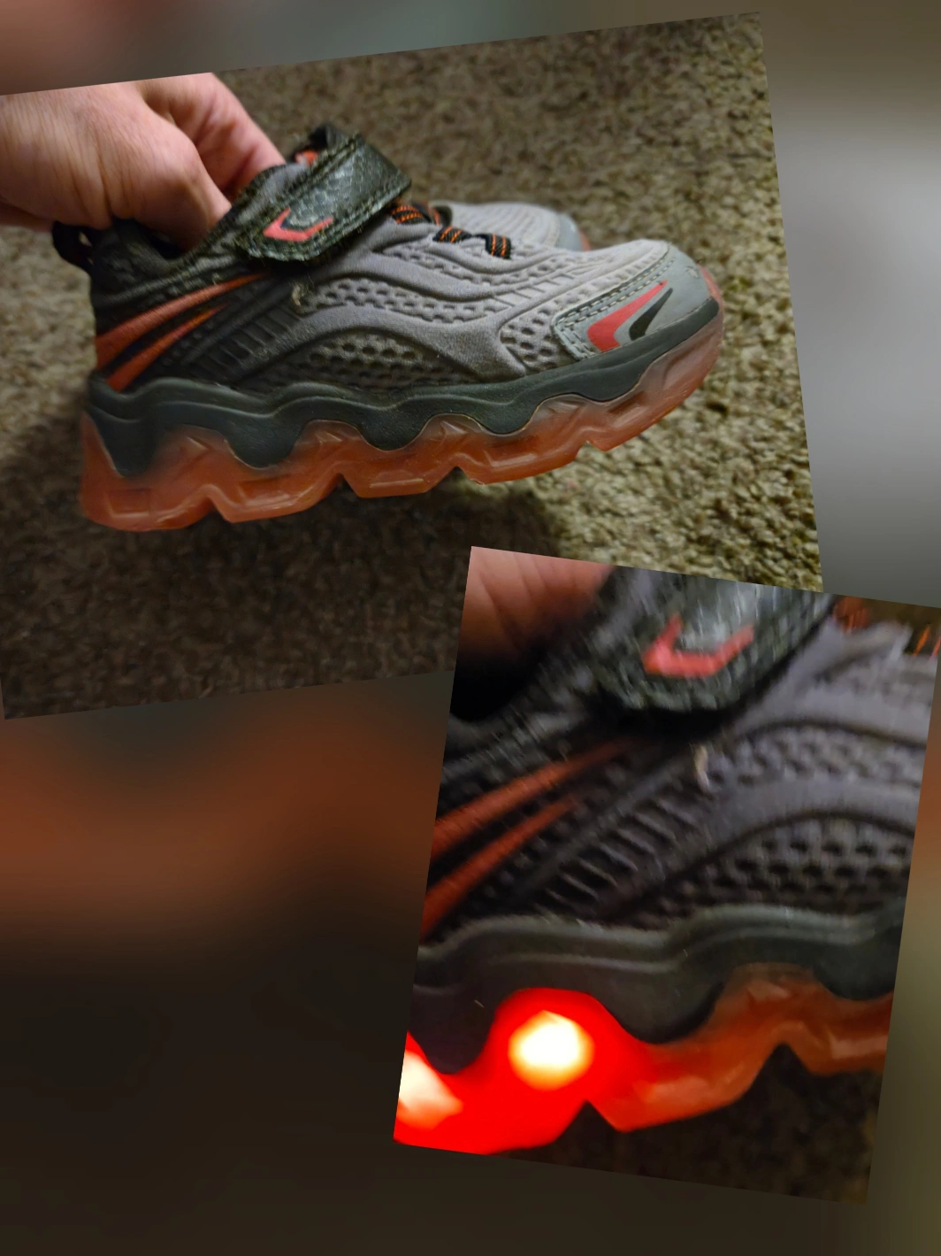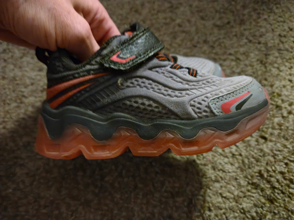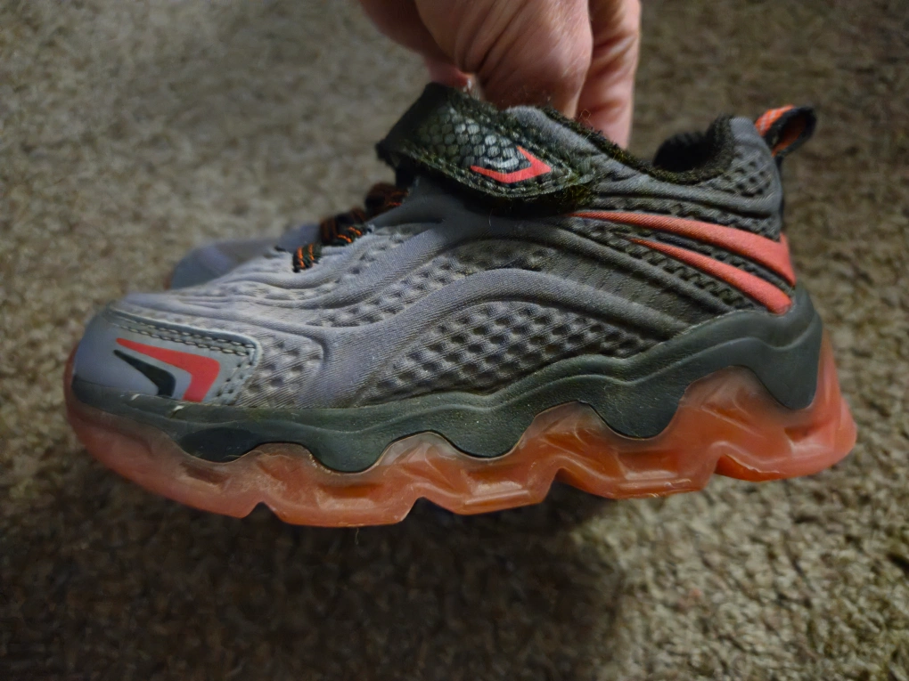 Selling a pair of Athletic kids' sneakers. They are grey with orange accents and have a light-up sole. Minor wear & Tear but super durable. both shoes light up.