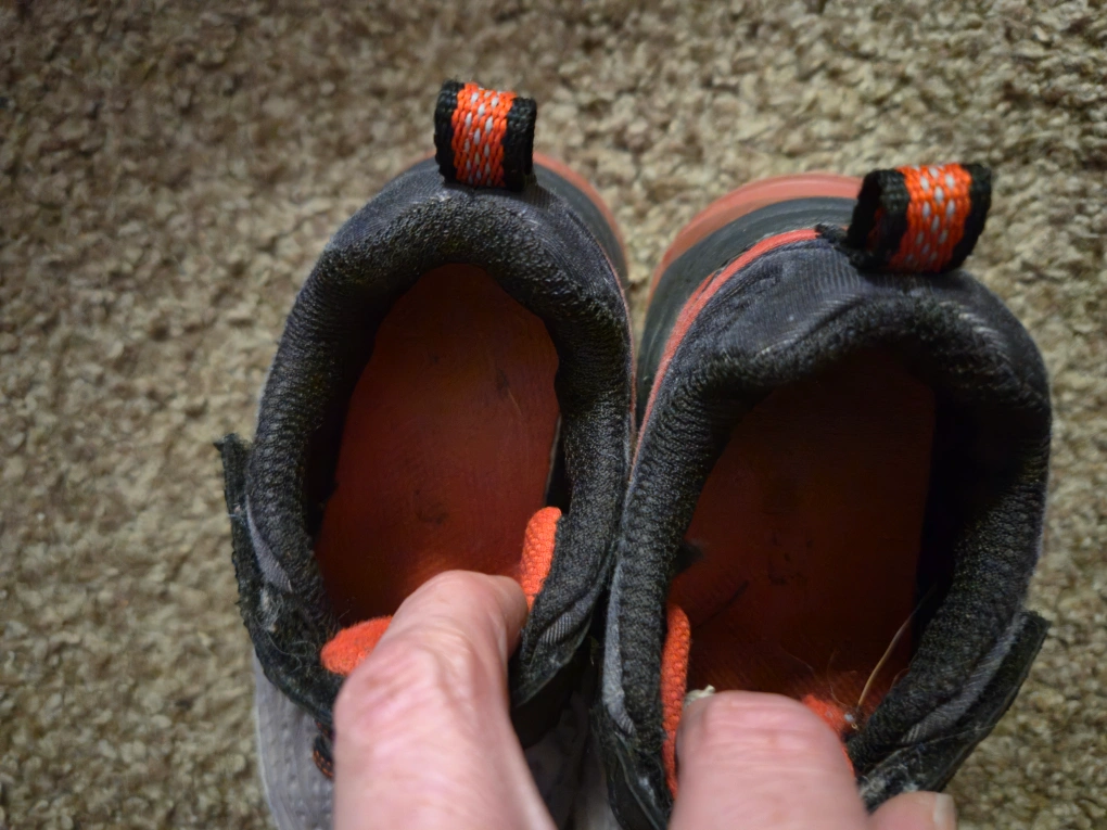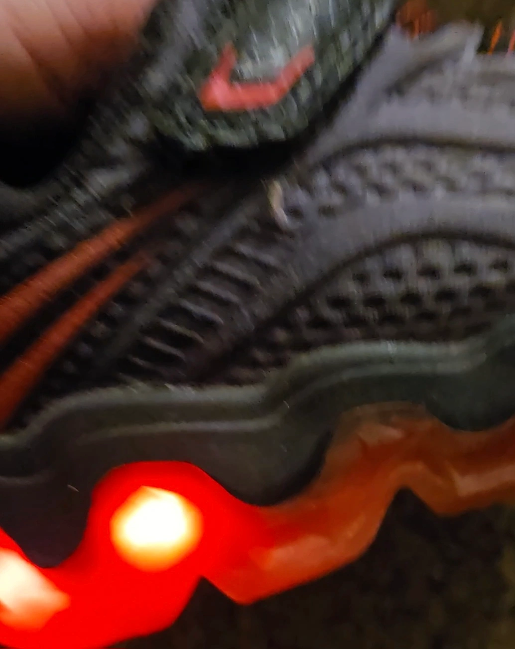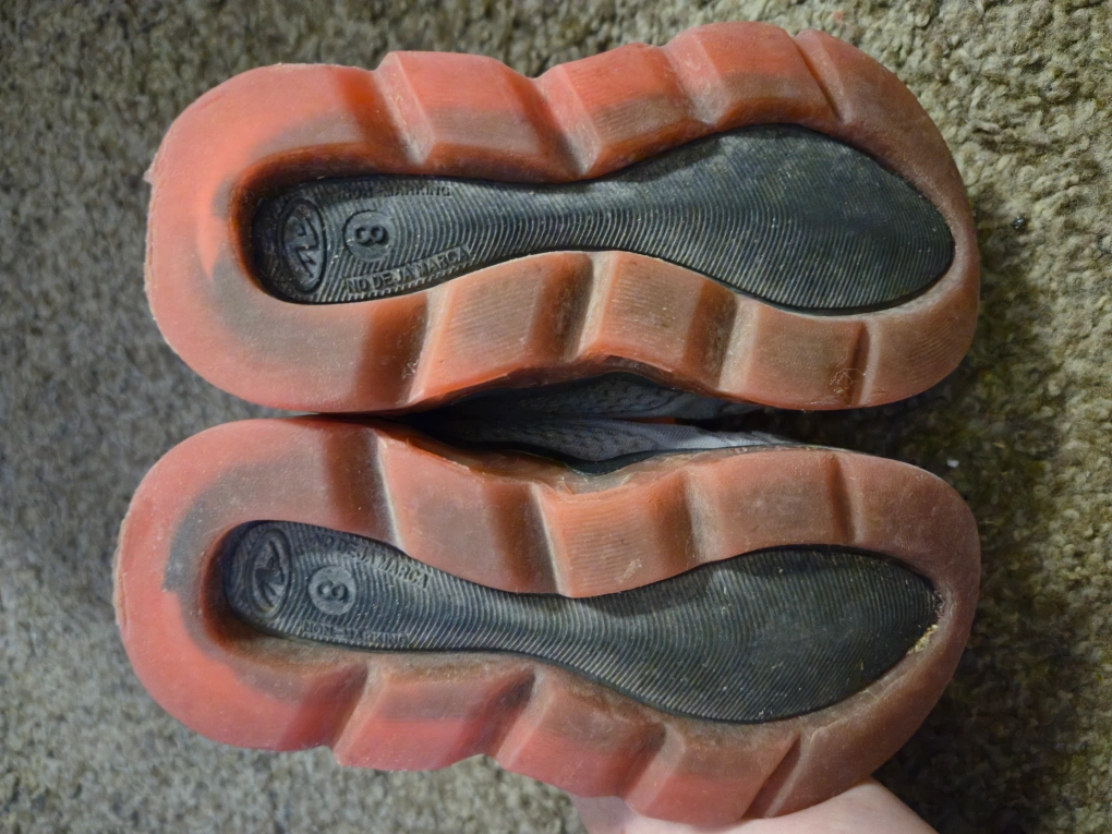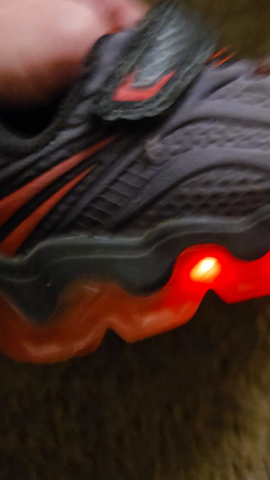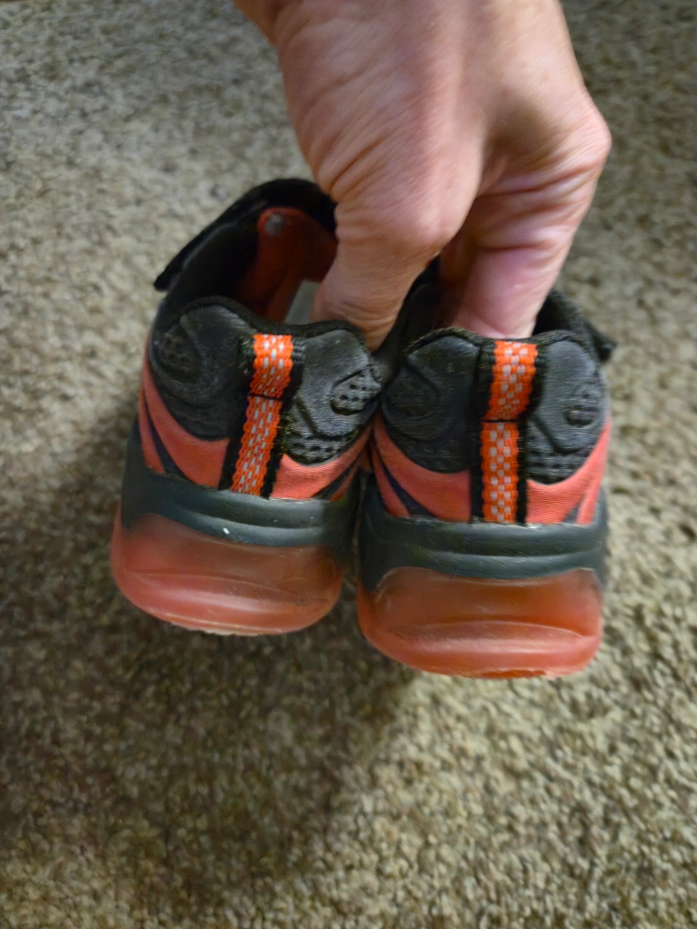 Selling a pair of Athletic kids' sneakers. They are grey with orange accents and have a light-up sole. Minor wear & Tear but super durable. both shoes light up.