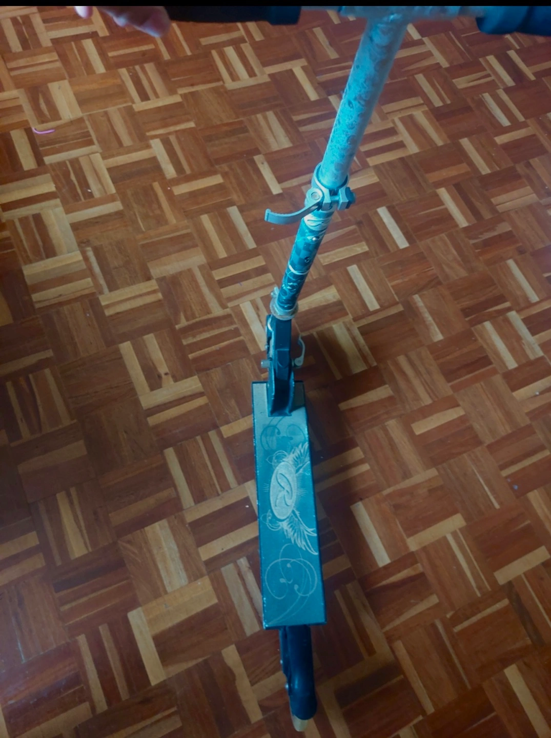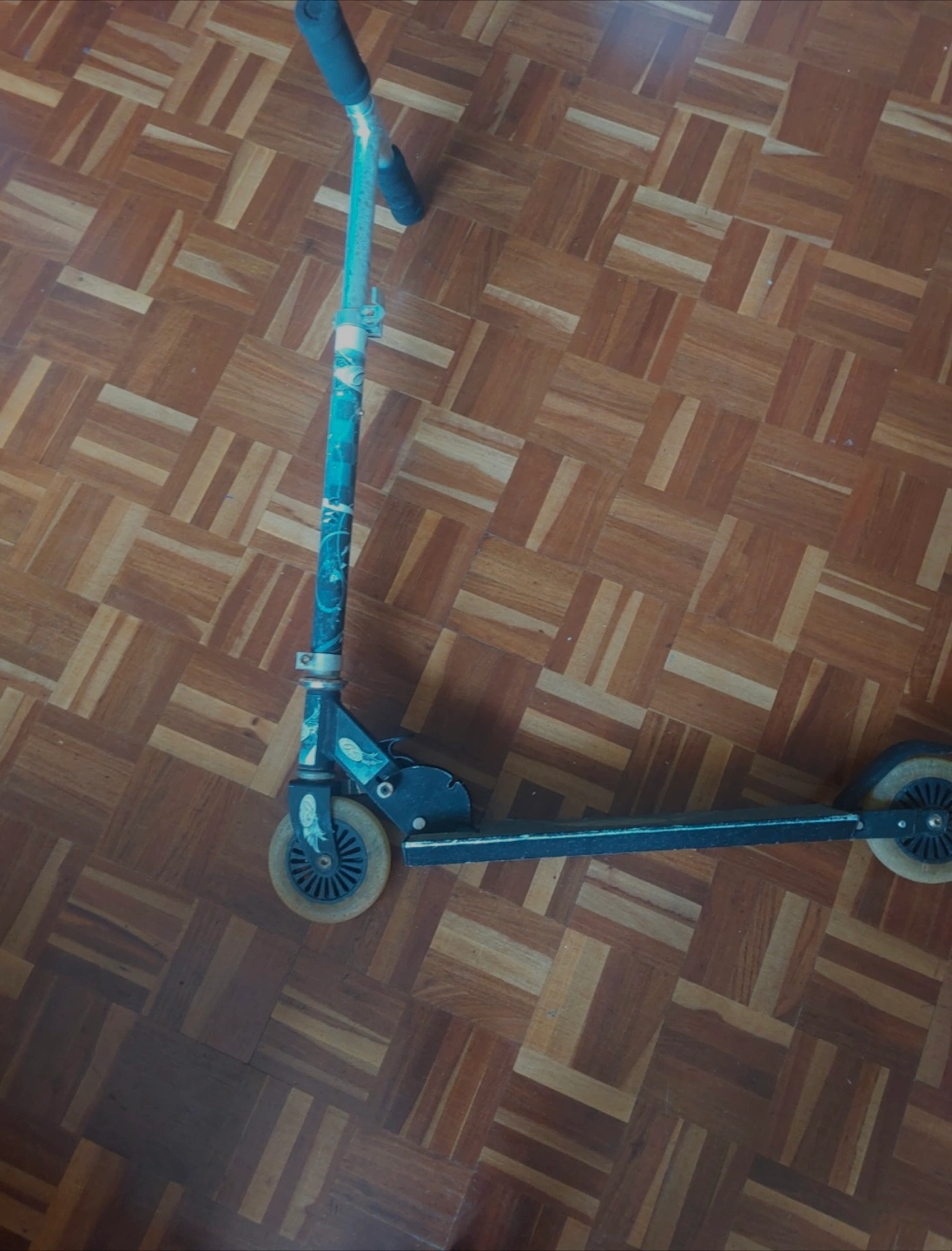 Kids' scooter, used condition. Black frame, a patterned deck. Suitable for children.๐๐