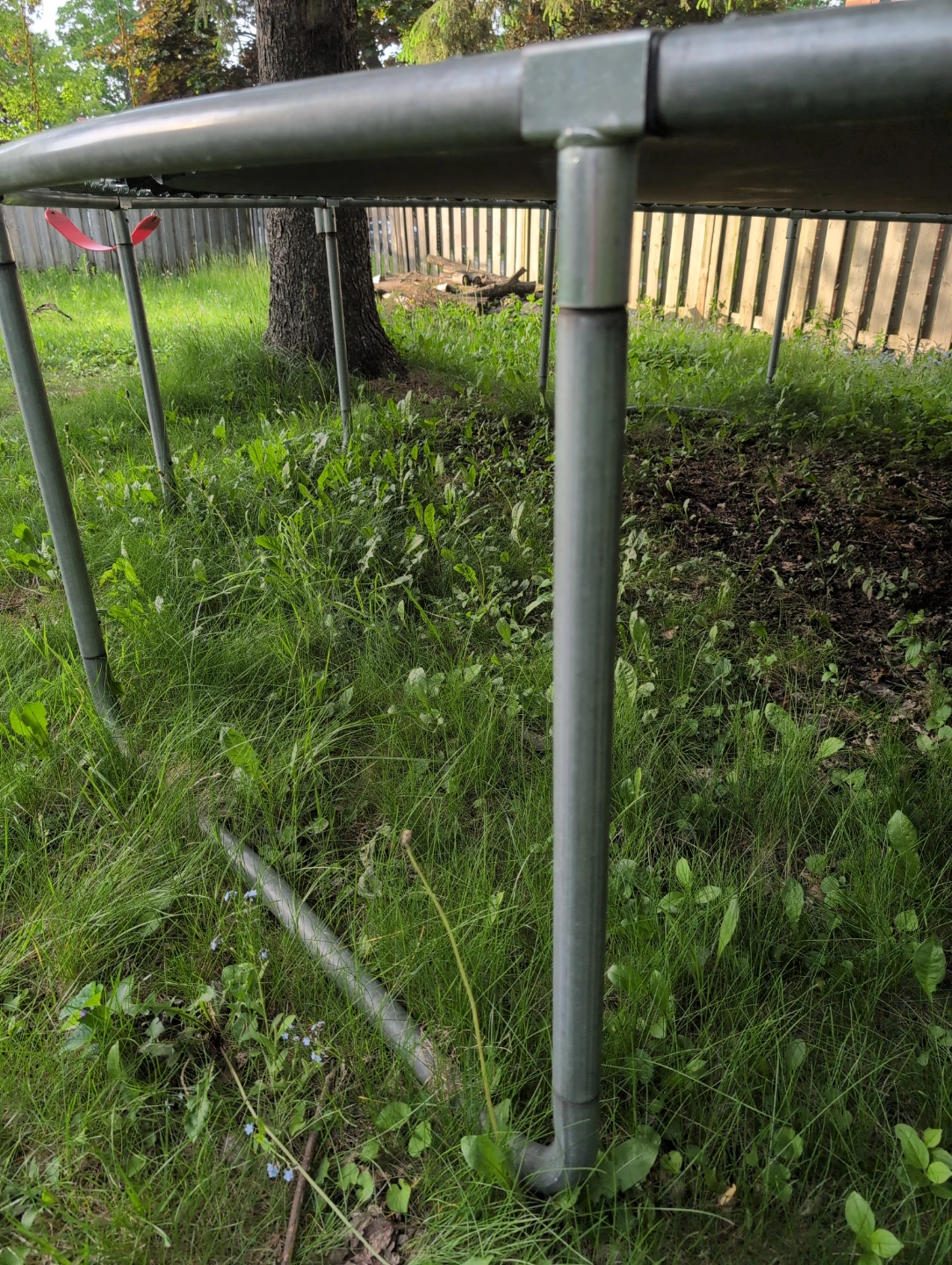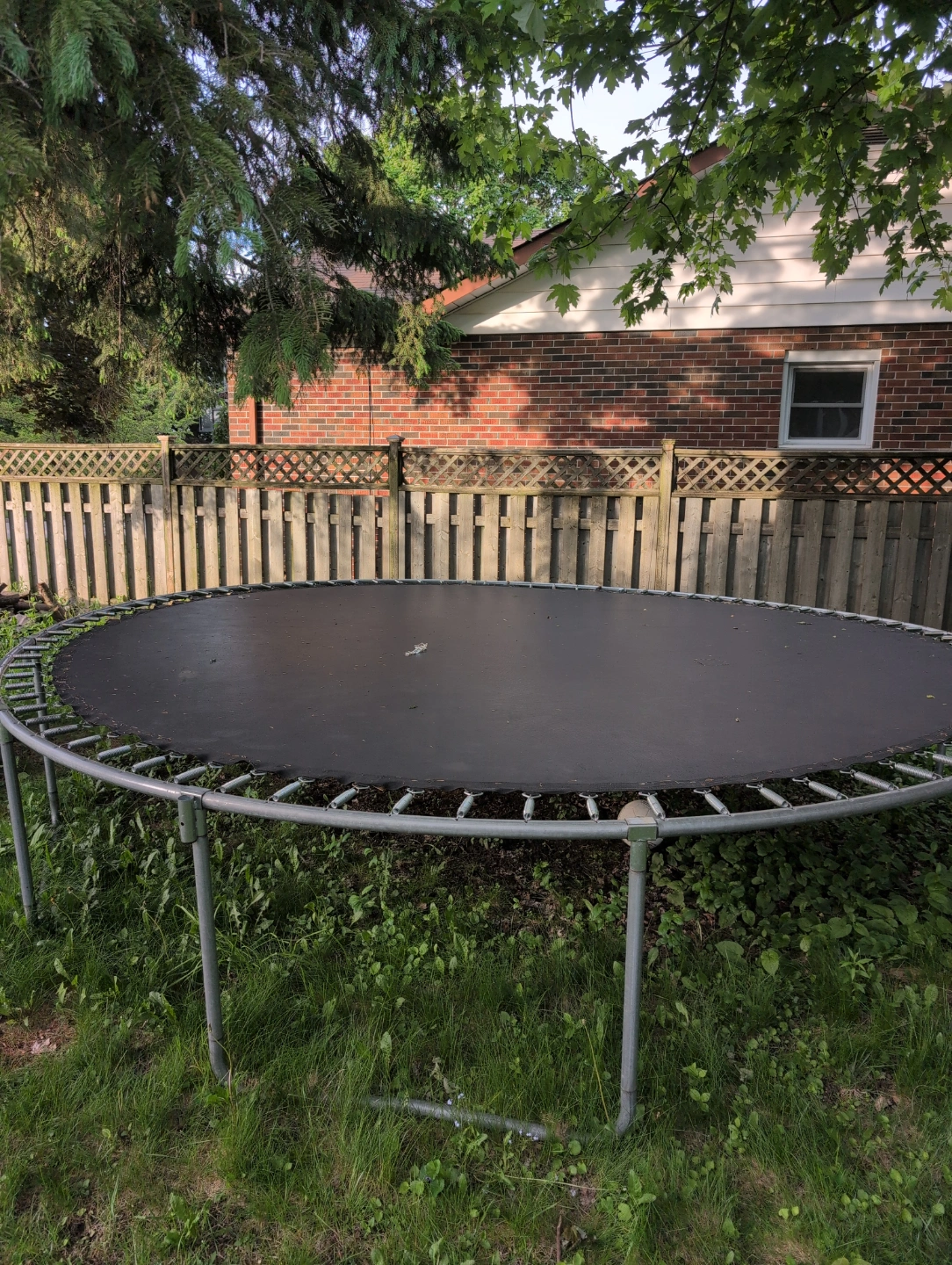 Round trampoline for sale. Good for backyard fun. 1 stitched rip. no rust.