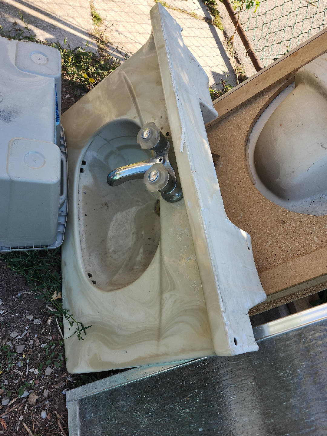 Selling a used sink with a faucet. It is a bit dirty and has some wear and tear, but it's still functional. Great for a DIY project or a quick replacement!