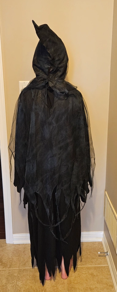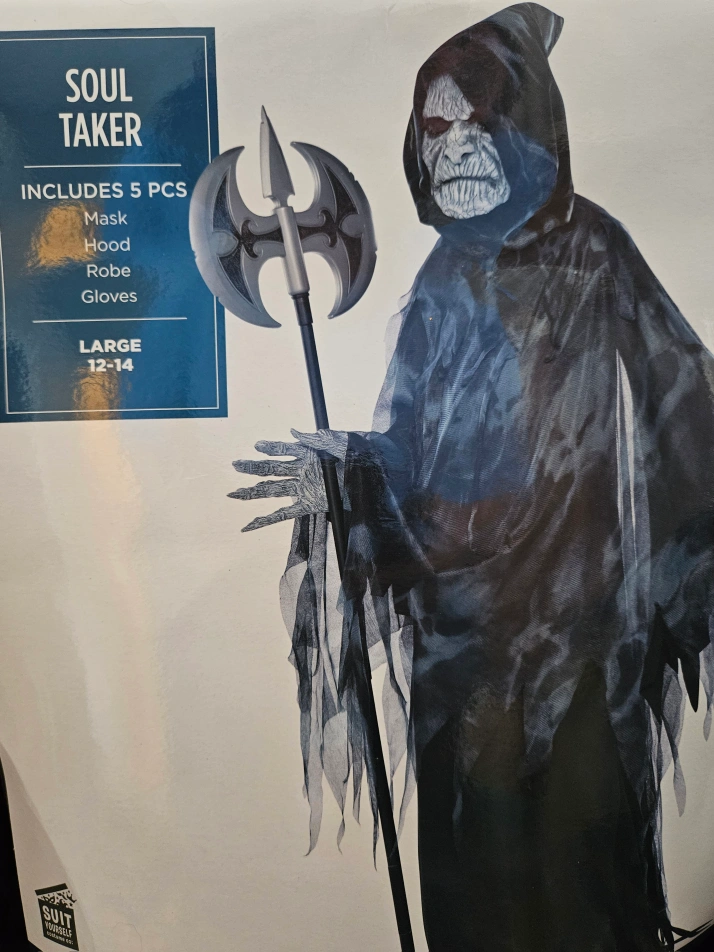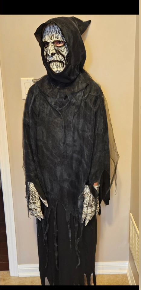 Used, very good condition, Soul Taker costume in kids size large (12-14 years) but could also be used for a tall 10-11 year old. Extra sizing information in attached picture. The costume includes a mask, hood, robe, and gloves. The black material that was covering the mask eye holes has been cut out for better vision.