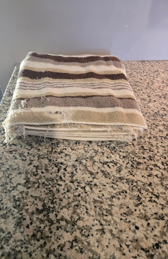 Used, soft, absorbent, 100% cotton, bath towel. Features beige and brown stripes. Some wear and tear. 26.4 inches wide by 47 inches long. Sorry, I cannot do deliveries. Buyer must be able to do a pickup. I am however, able to do a meet up at a specific location in downtown St Catharines though.