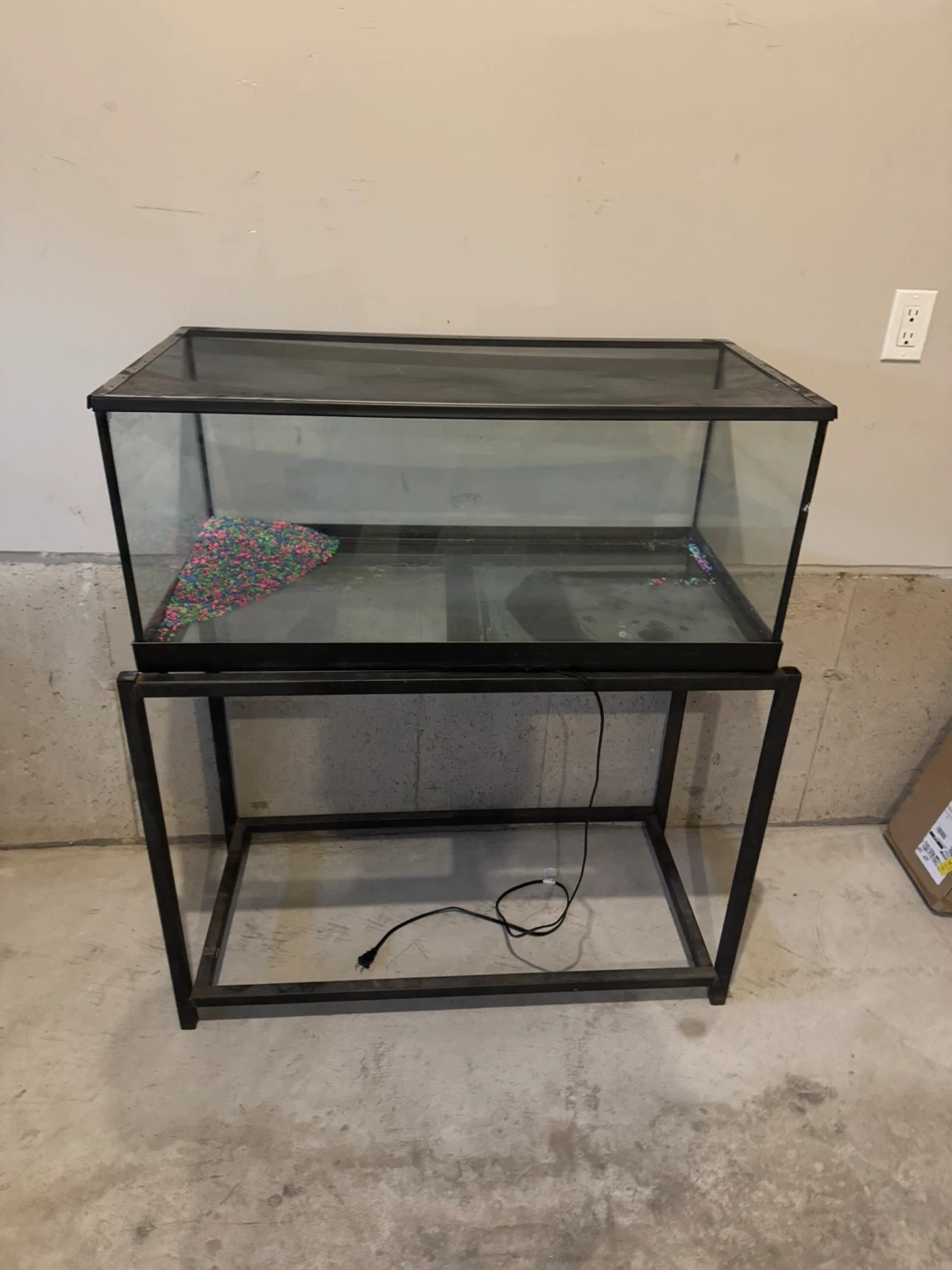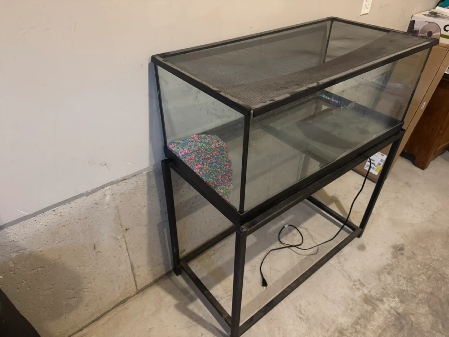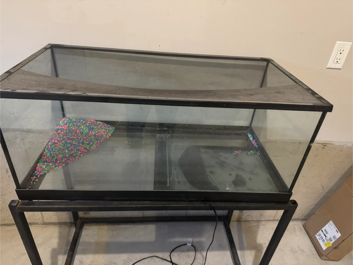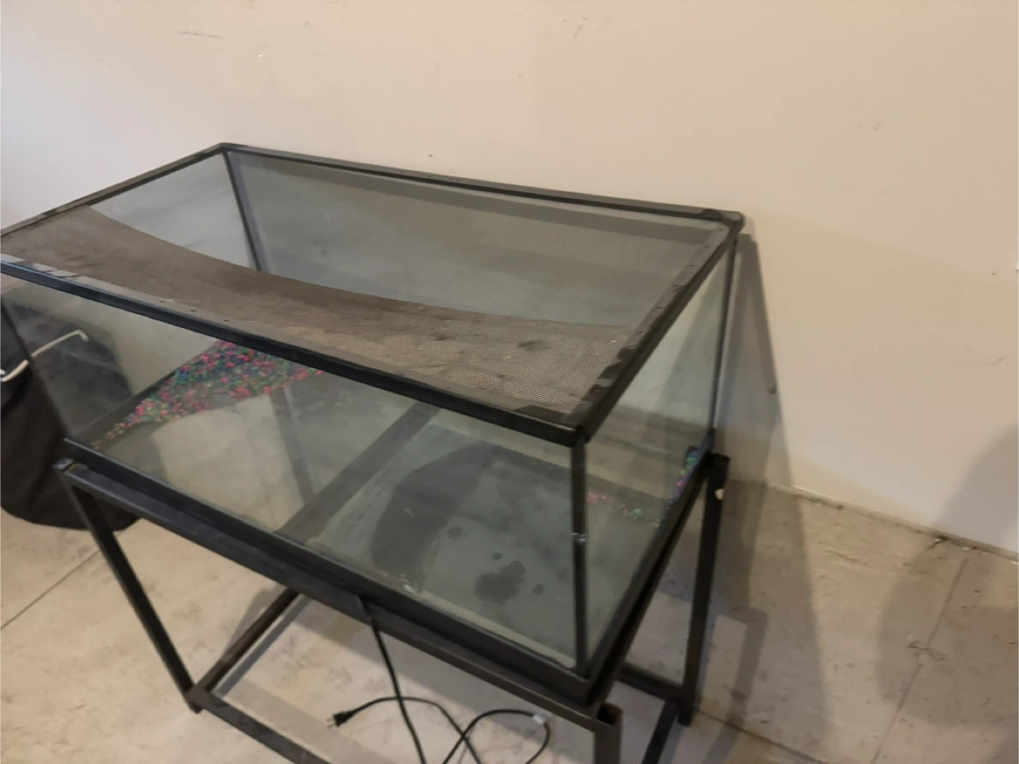 Selling a used tank that comes with a sturdy stand. It's perfect for setting up a new home for your (non-water) friends. There are some signs of use, but it's still in really good condition and ready to go!