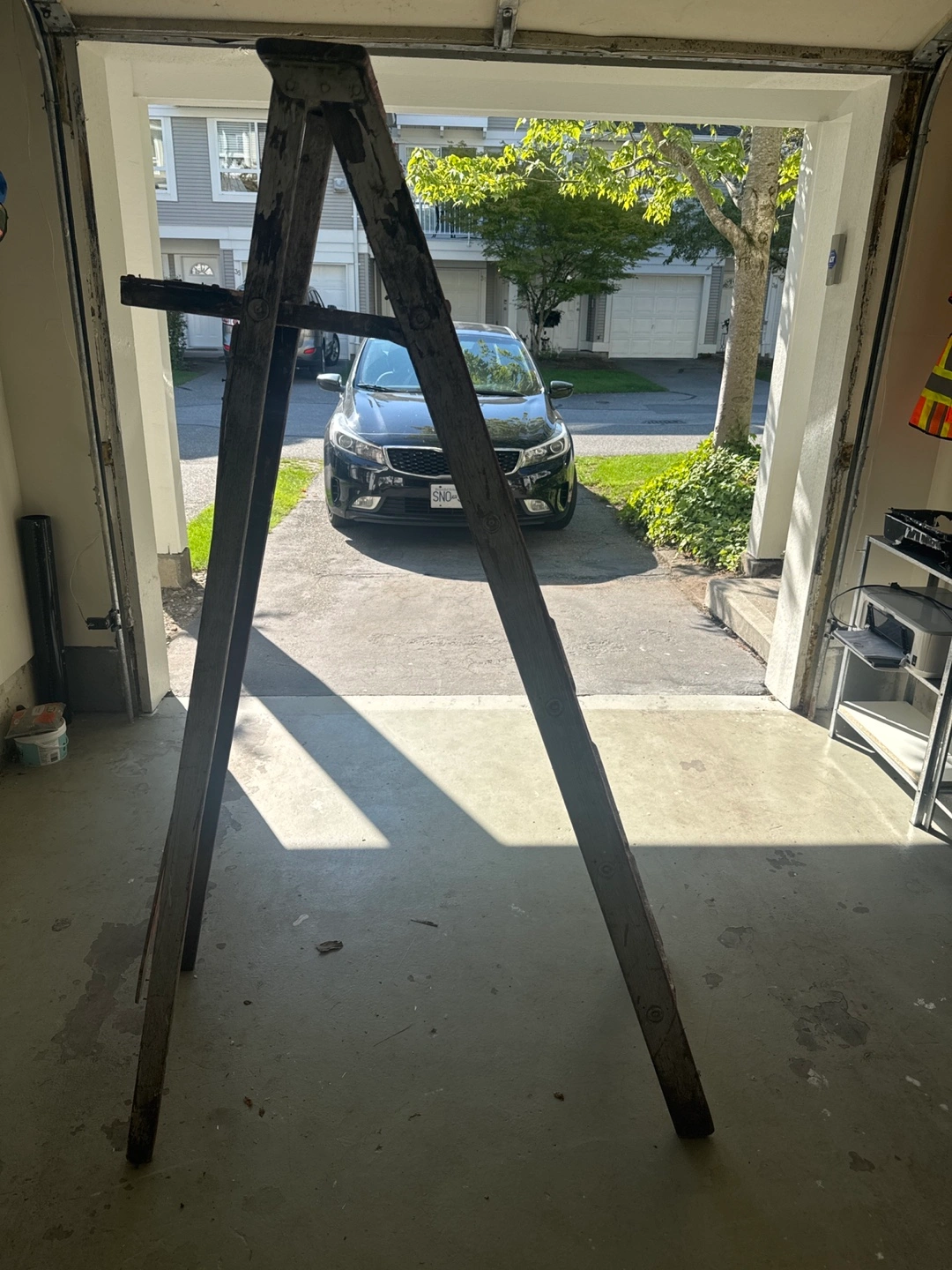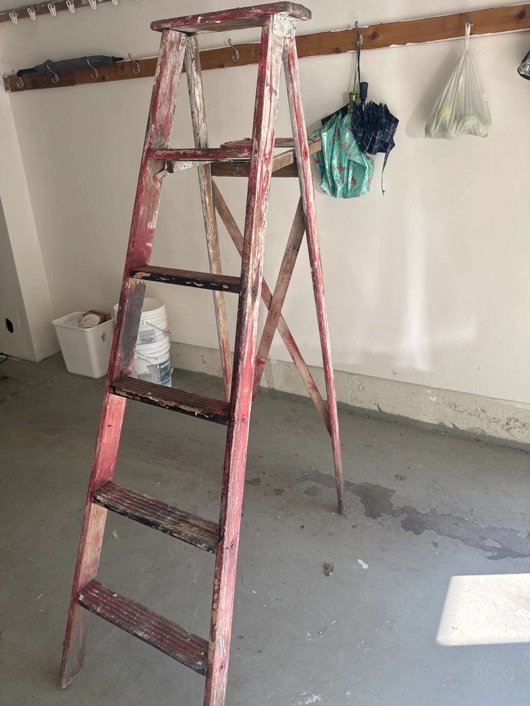 Vintage wooden ladder, perfect for a DIY project or as a decorative piece. It has a rustic, weathered look with red paint and signs of wear, giving it a unique character. It's sturdy but shows its age, so it's ideal for someone who want to use for household