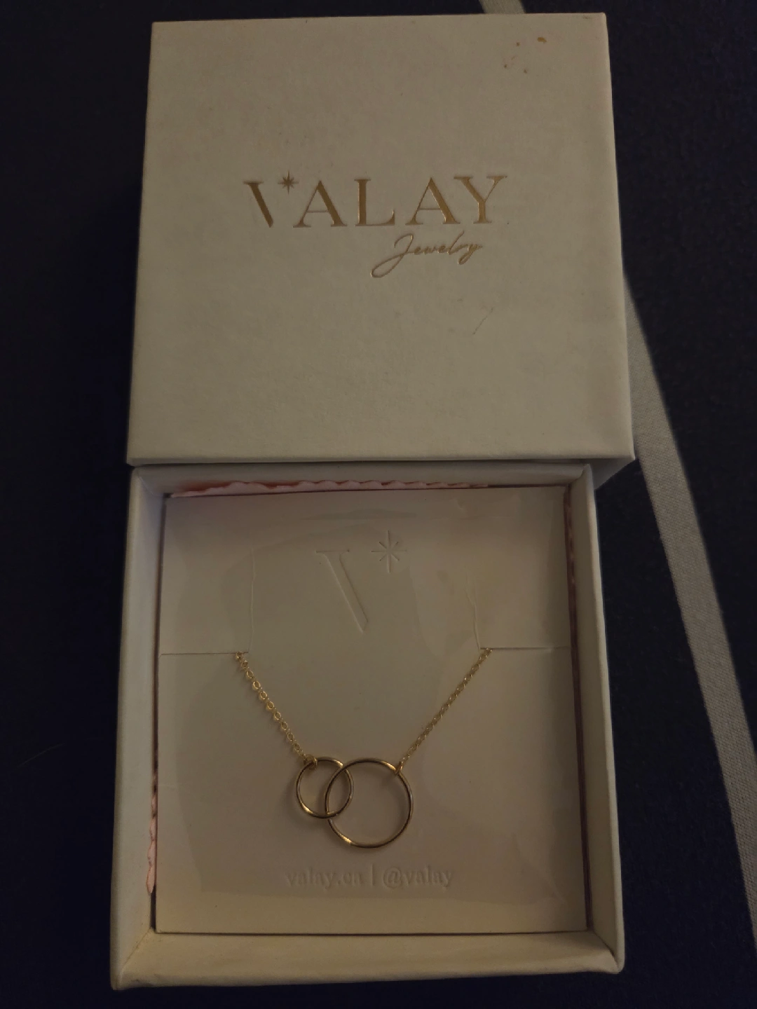 Selling a beautiful gold necklace from Valay Jewelry! It features an interlocking circle design. Comes in its original box with the pink lining. Perfect for adding a touch of elegance to any outfit!