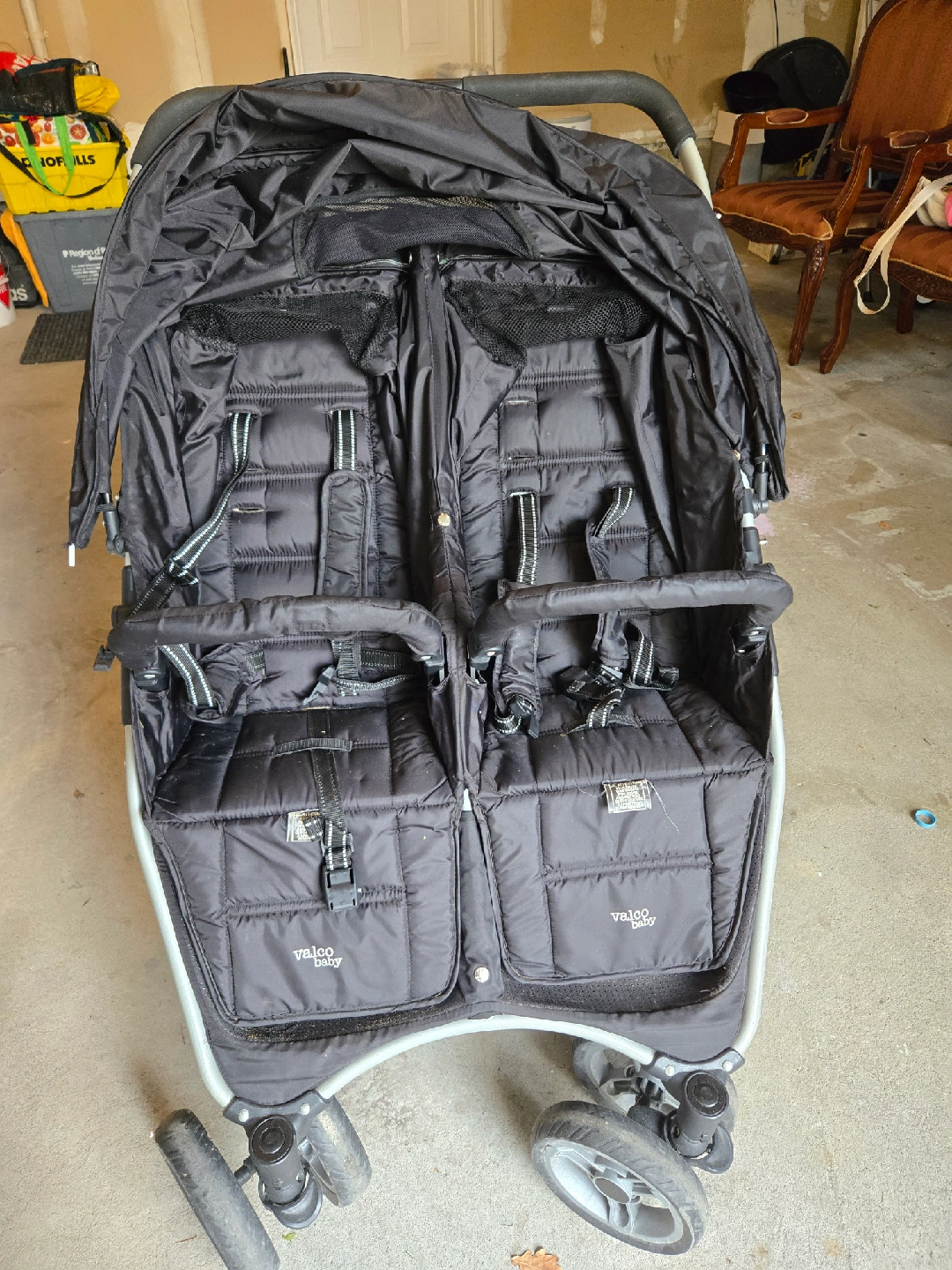 Selling a Valco Baby twin stroller in black. It's in great condition and ready for your little ones! Perfect for walks around the neighbourhood or trips to the park. It features a large canopy and storage. small tear in hood awning. lightweight and great for travel.