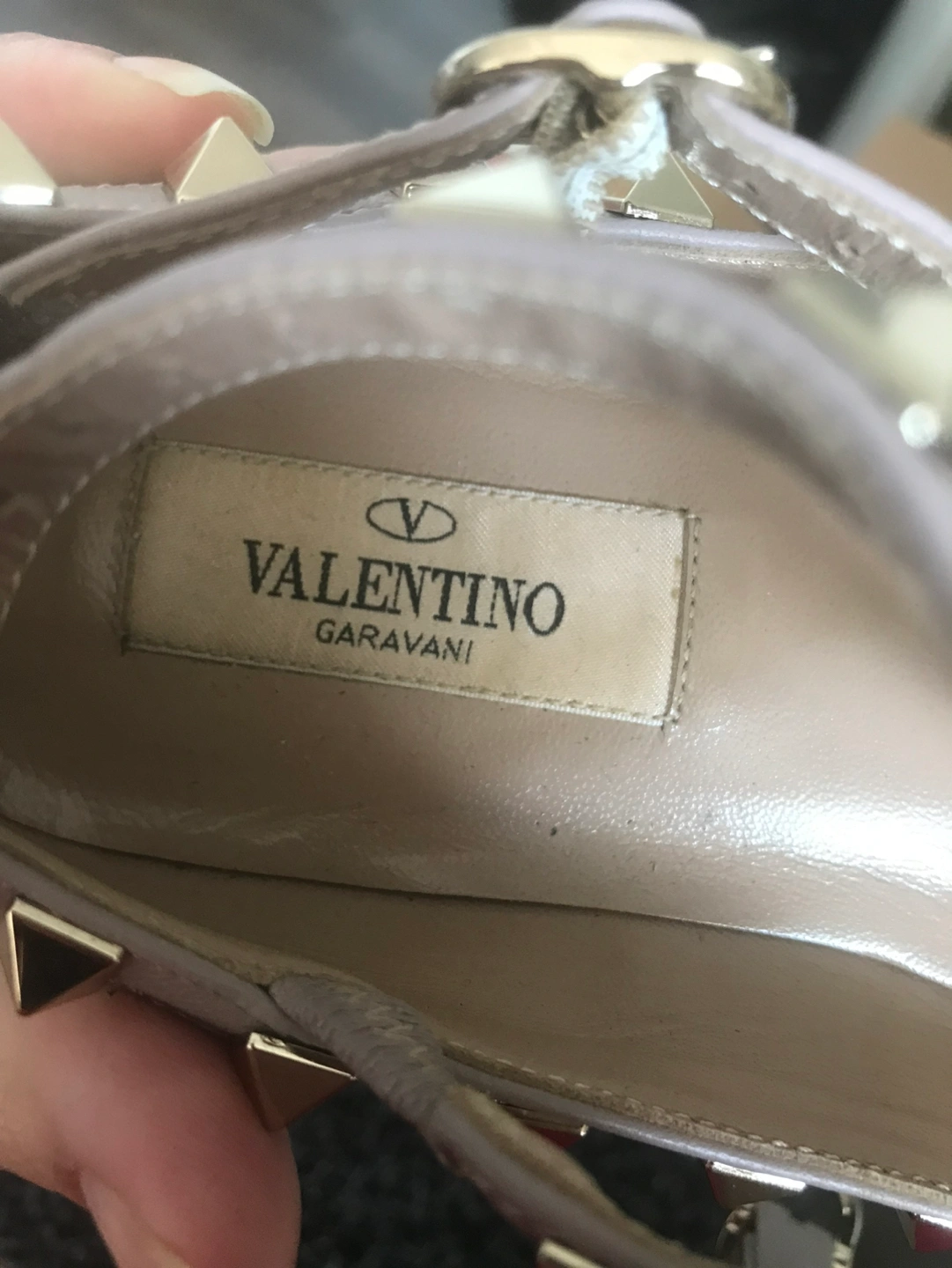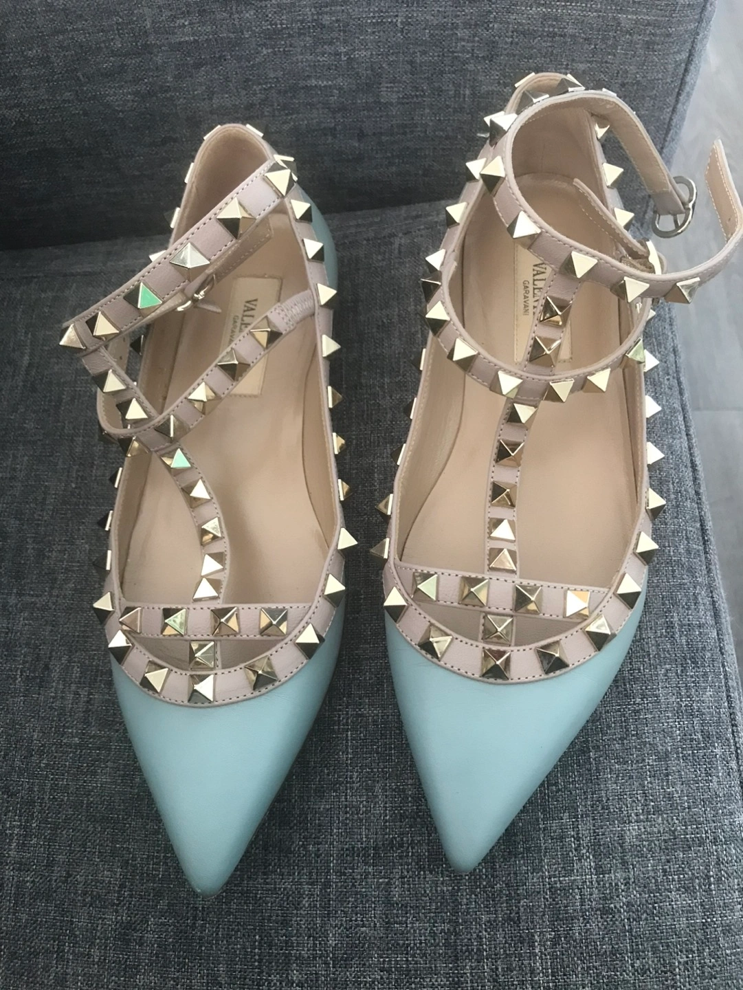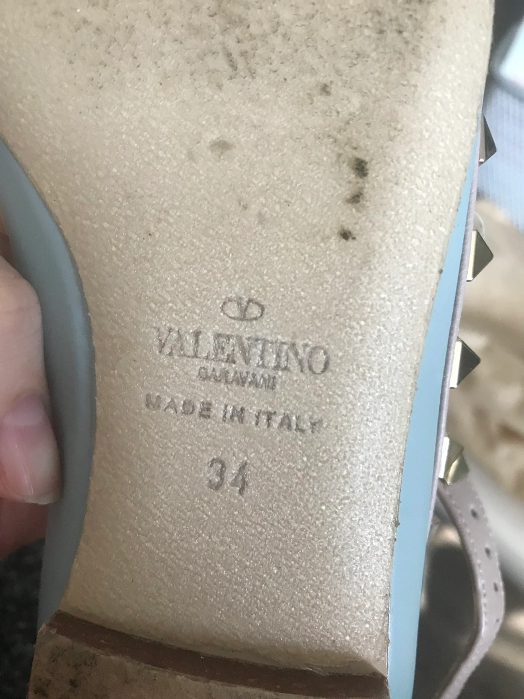Description * Rockstud Accents * Leather Trim * Pointed-Toes * tiny scuff on toe * Light blue and beige patent leather with gold studs * Adjustable straps * Size 34 * made in Italy * Comes With dustbag Designer Fit: shoes by Valentino typically run a half size small.