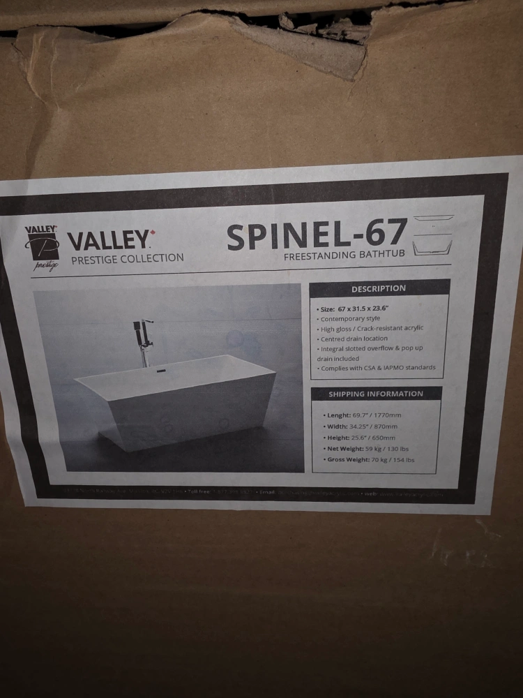 Selling a Valley Prestige Collection Spinel-67 freestanding bathtub! It's a contemporary style tub made with high gloss, crack-resistant acrylic. The size is 67 x 31.5 x 23.6 inches. It also features a centred drain location and an integrated overflow with a pop-up drain included. Comes with CSA & IAPMO standards