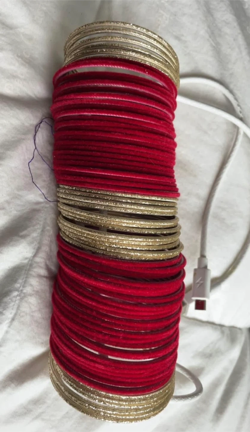 Selling a set of red velvet and gold bangles! They're in great condition and would be a lovely addition to any outfit
