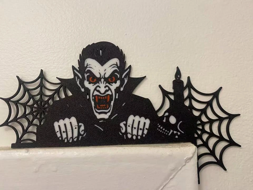 Vampire Corner Decor Turn your home into a spooky haunted castle! 3D printed with detailed design Features vampire fangs + red eyes + spider webs + skull candle Option for Glow-in-the-dark material (Green/Orange) for extra scary effect Lightweight & easy to place on corners, shelves, or wall edges Sizes & Prices 7 inch → $10 9 inch → $20 11 inch → $40 Glow material +$5