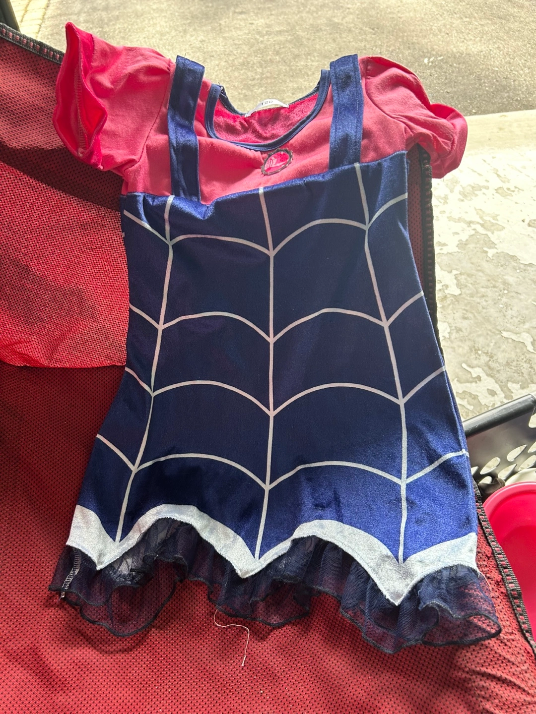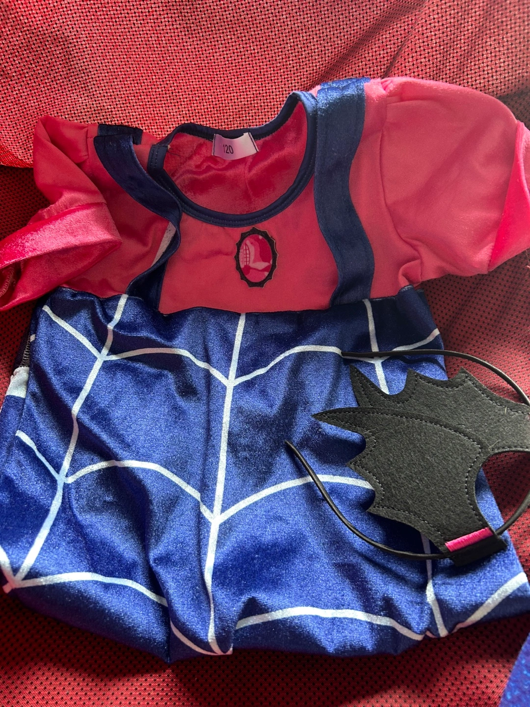 Selling a cute Vampirina costume! It's size 4-6 and features a pink top and a blue skirt with a web pattern. Comes with a matching headband, missing one wing. Perfect for dress-up or Halloween!