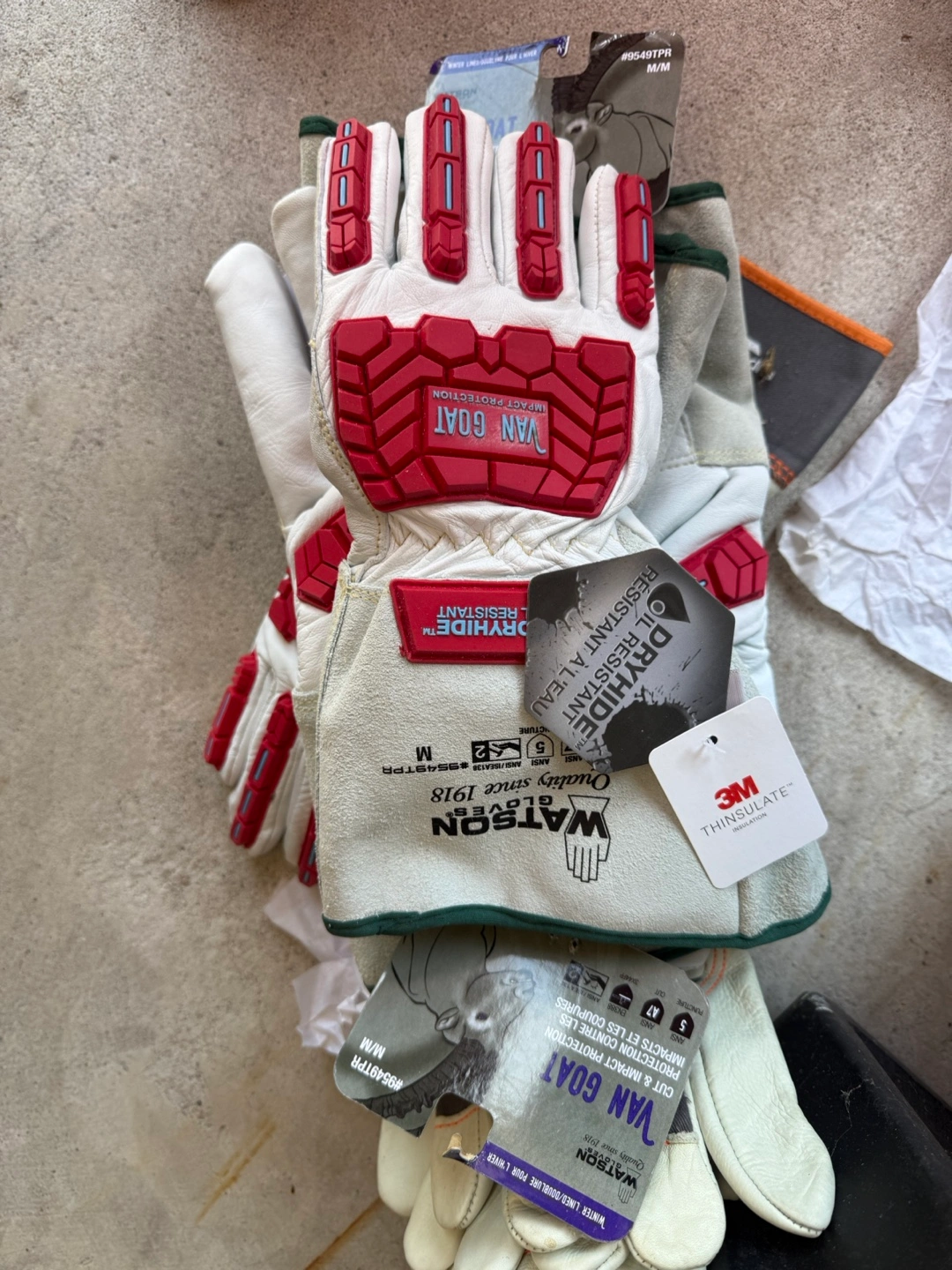 These Van Goat cut-resistant gloves are medium/eight and measure 13 inches in length. These red and white gloves are uncoated, have goatskin palms, and are gunn cut. They are ANSI cut level A5, ANSI puncture level five, ANSI puncture force 150, ANSI abrasion cycle 1000, ANSI abrasion level three, and can withstand a cutting load of up to 2200 grams. Size: M,XL Brand New $25 each pair.