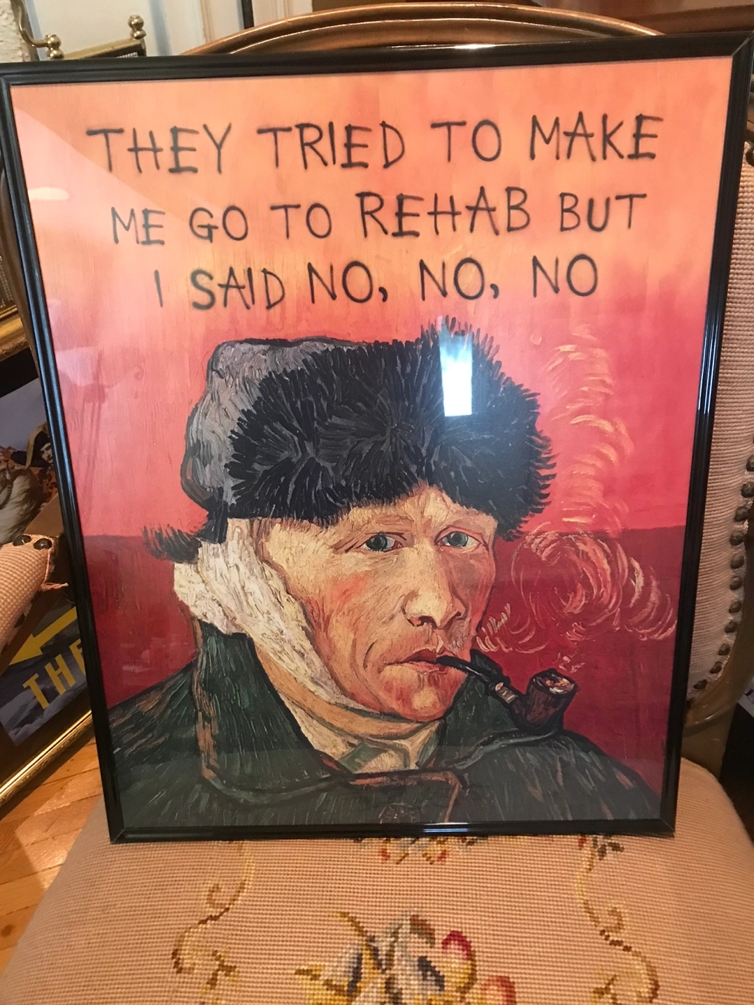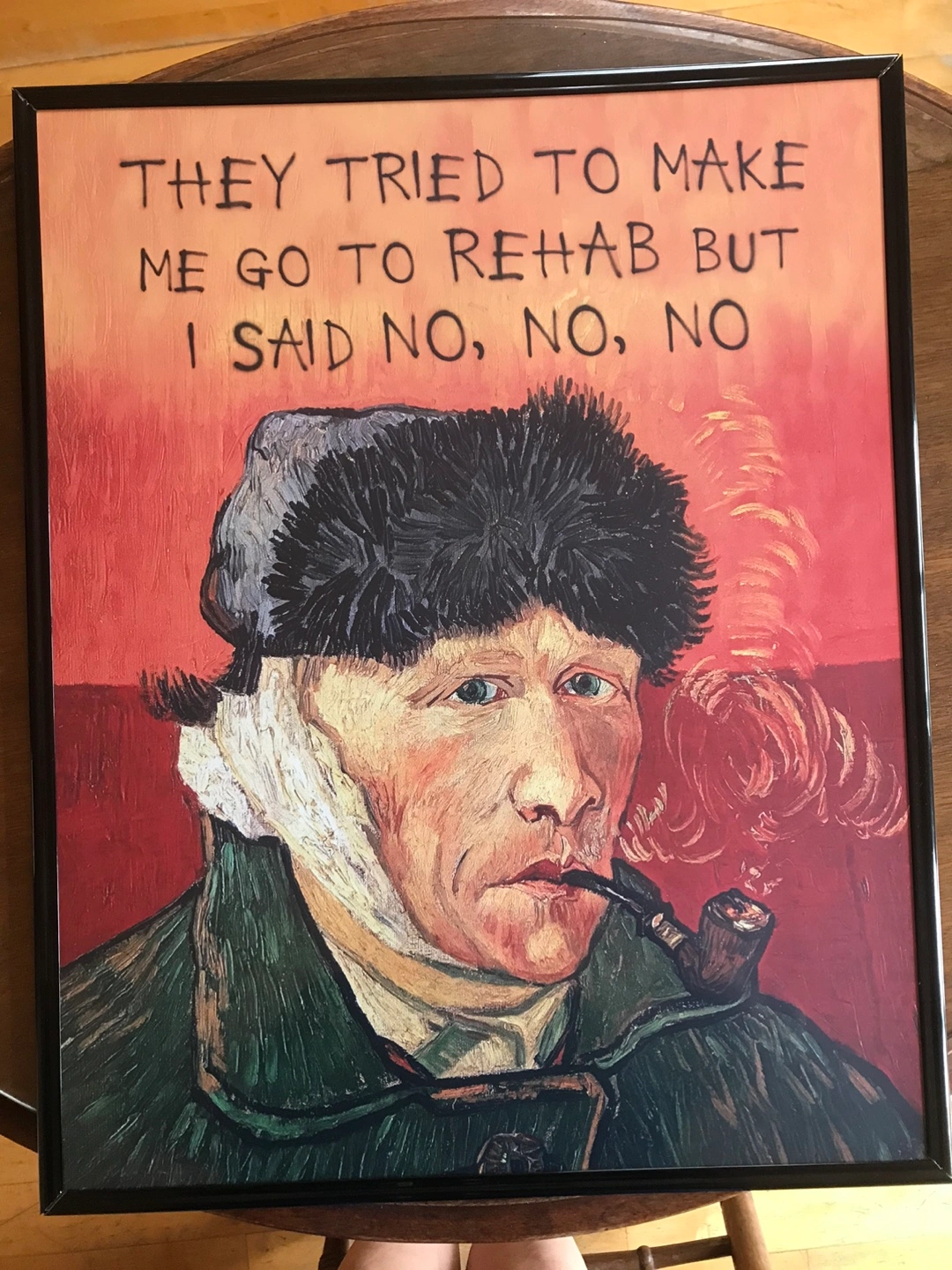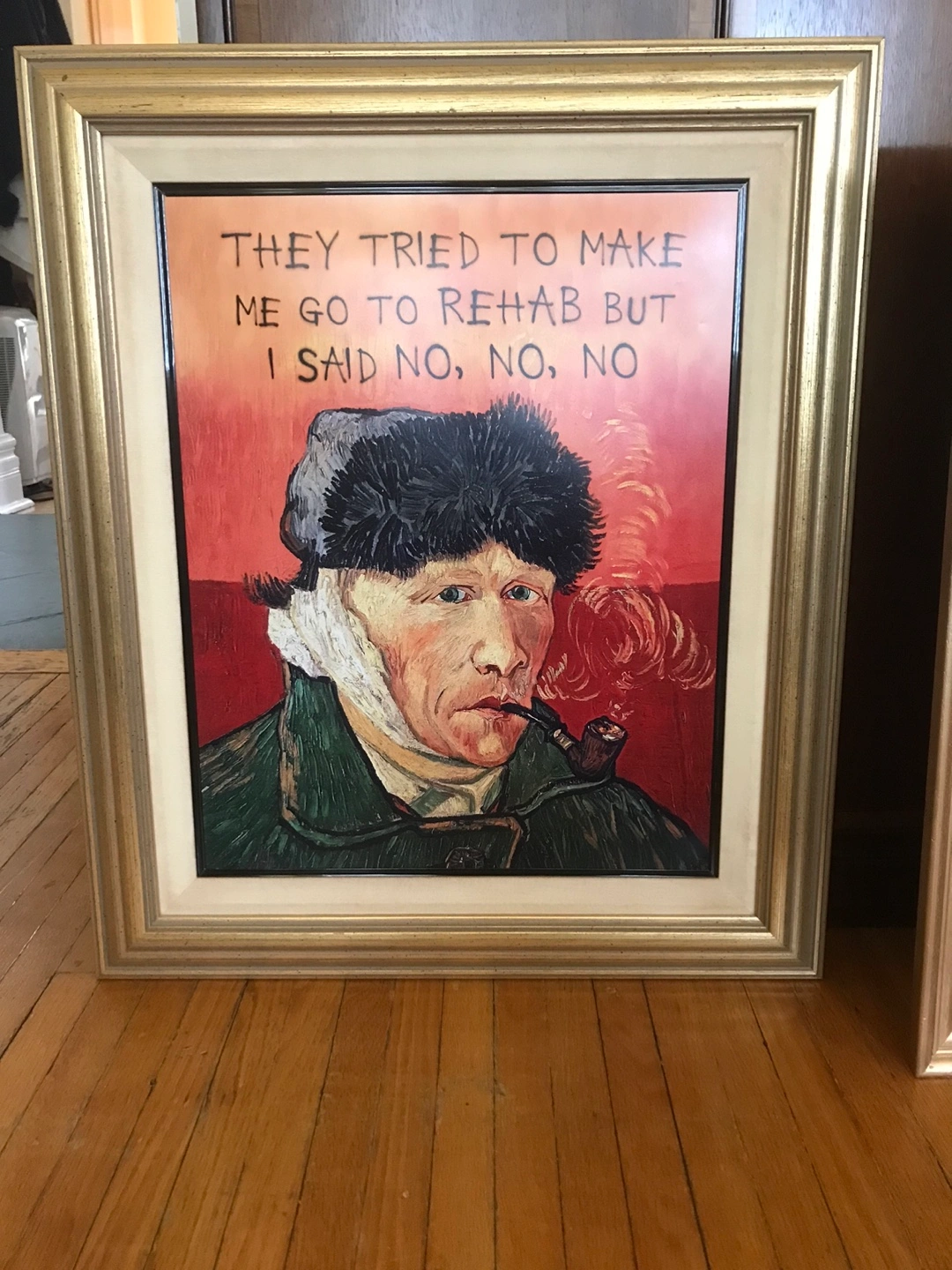 Features a print of Vincent Van Gogh with an Amy Winehouse caption that reads "They Tried To Make Me Go To Rehab But I Said No, No, No." This frame is modern but it looks equally, if not more amazing in a more ornate gold frame. This print I ordered from the UK for an event I was doing. It was used for the party and I’m now looking for it’s forever home. Very unique fun piece. Yonge/Davisville pick up.