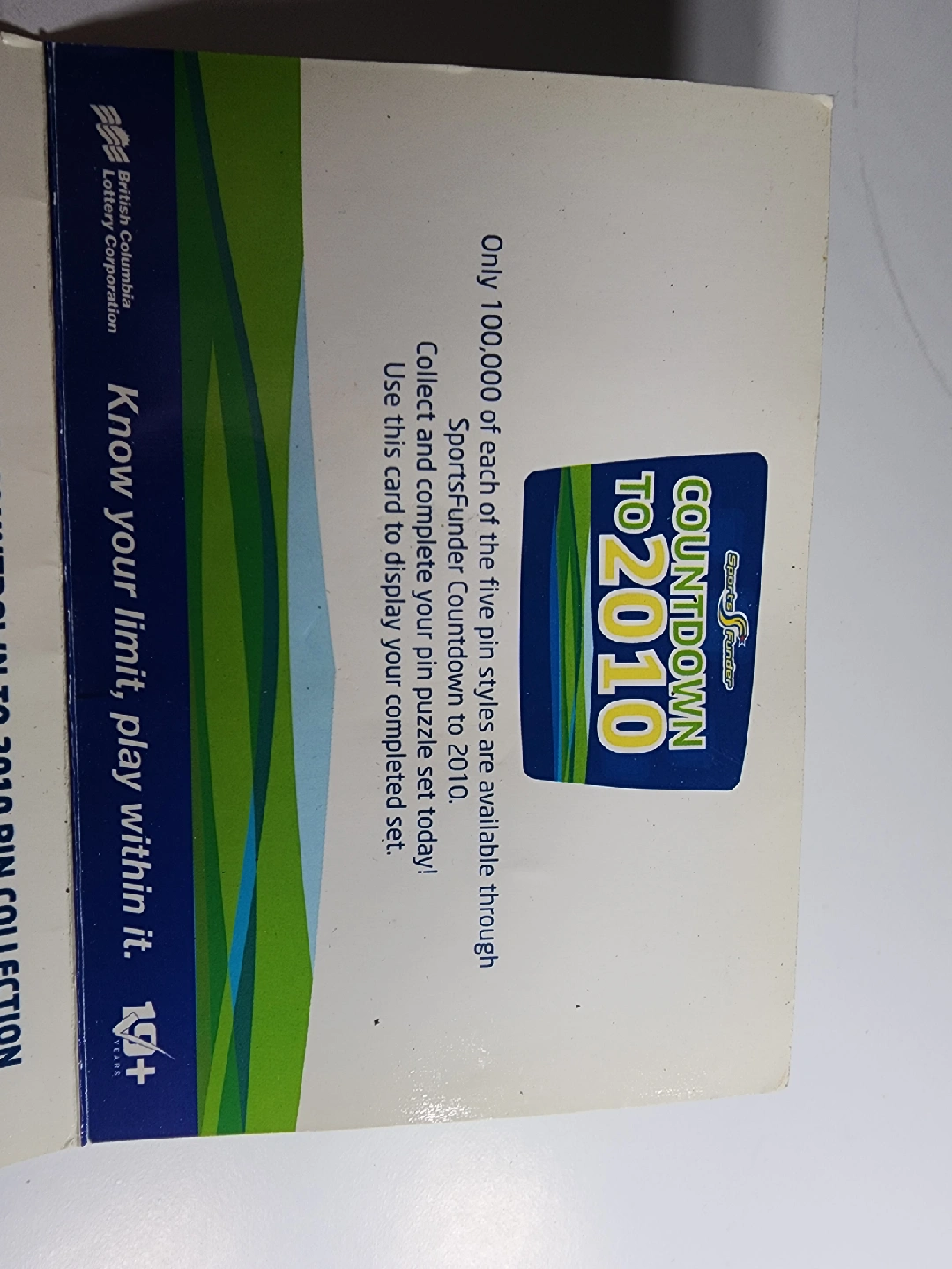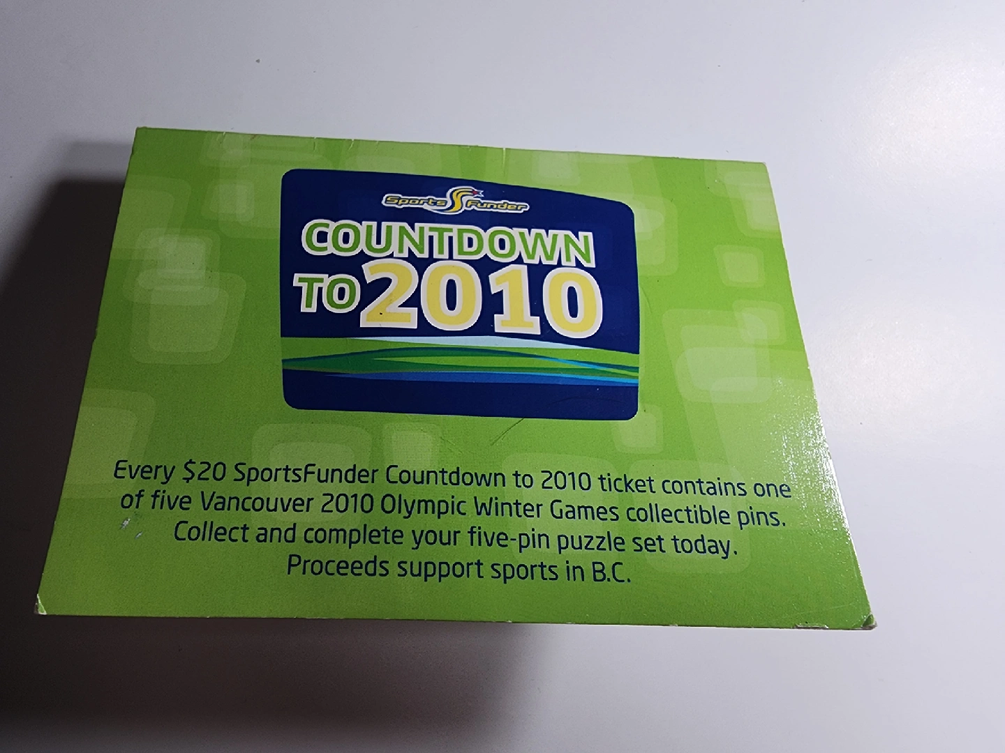Selling a complete set of five Vancouver 2010 Olympic Winter Games collectible pins. These pins were originally available through SportsFunder Countdown to 2010. Only 100,000 of each of the five pin styles were made! Collect and complete your pin puzzle set today! Comes with the original display card.