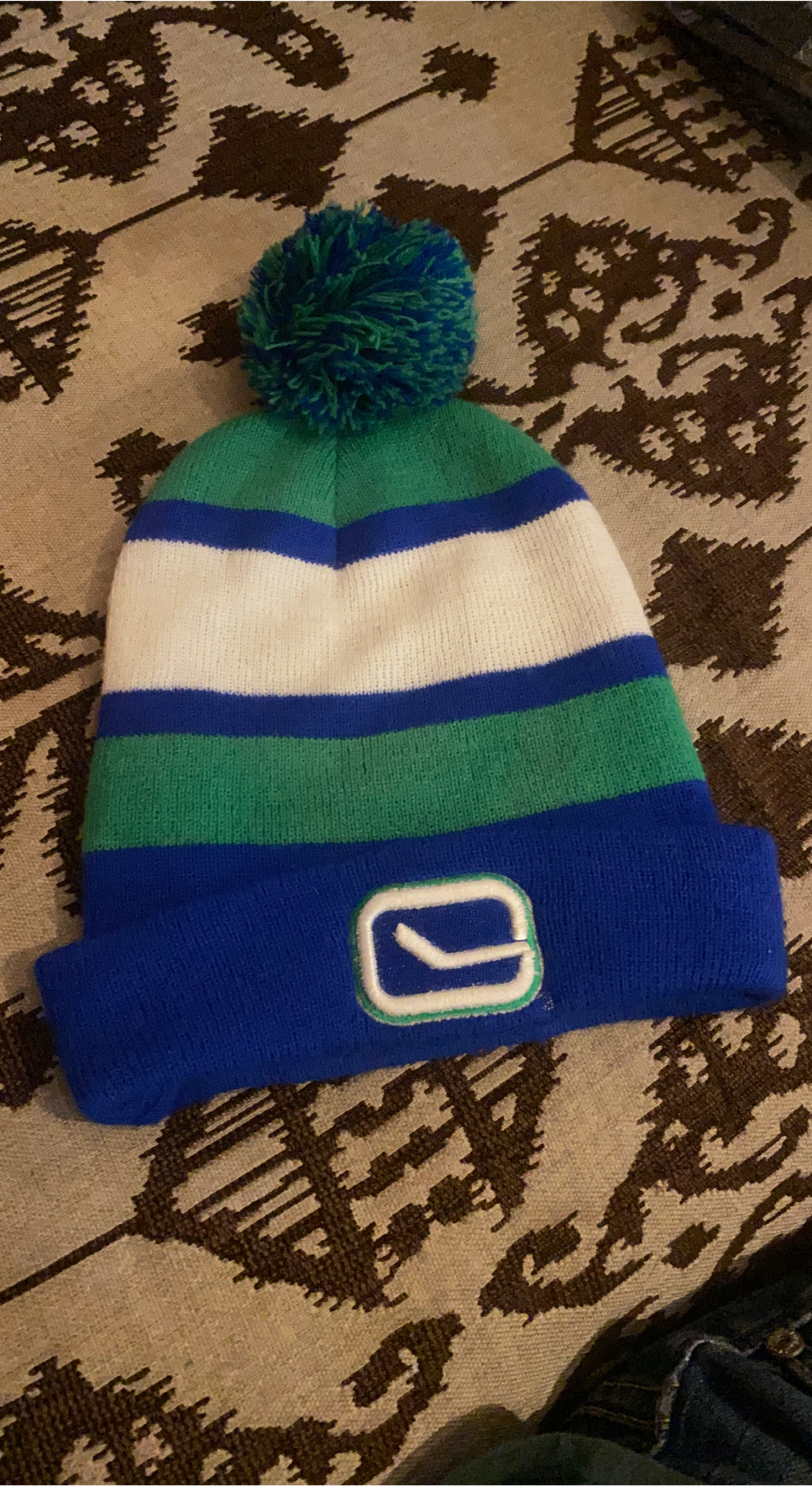 Selling a Vancouver Canucks beanie in great condition! It's blue, green, and white with a pompom on top. It also has a Budweiser patch on the back.