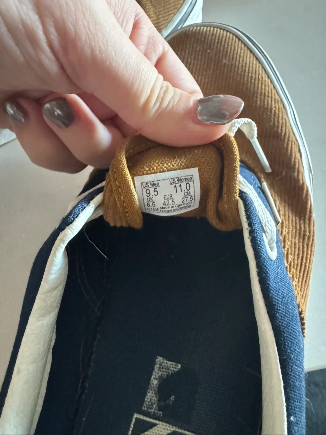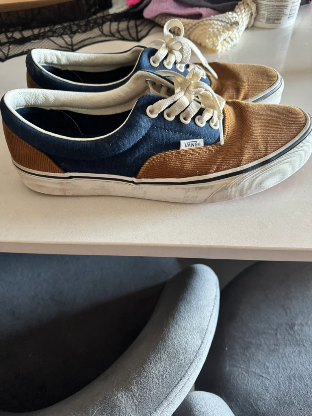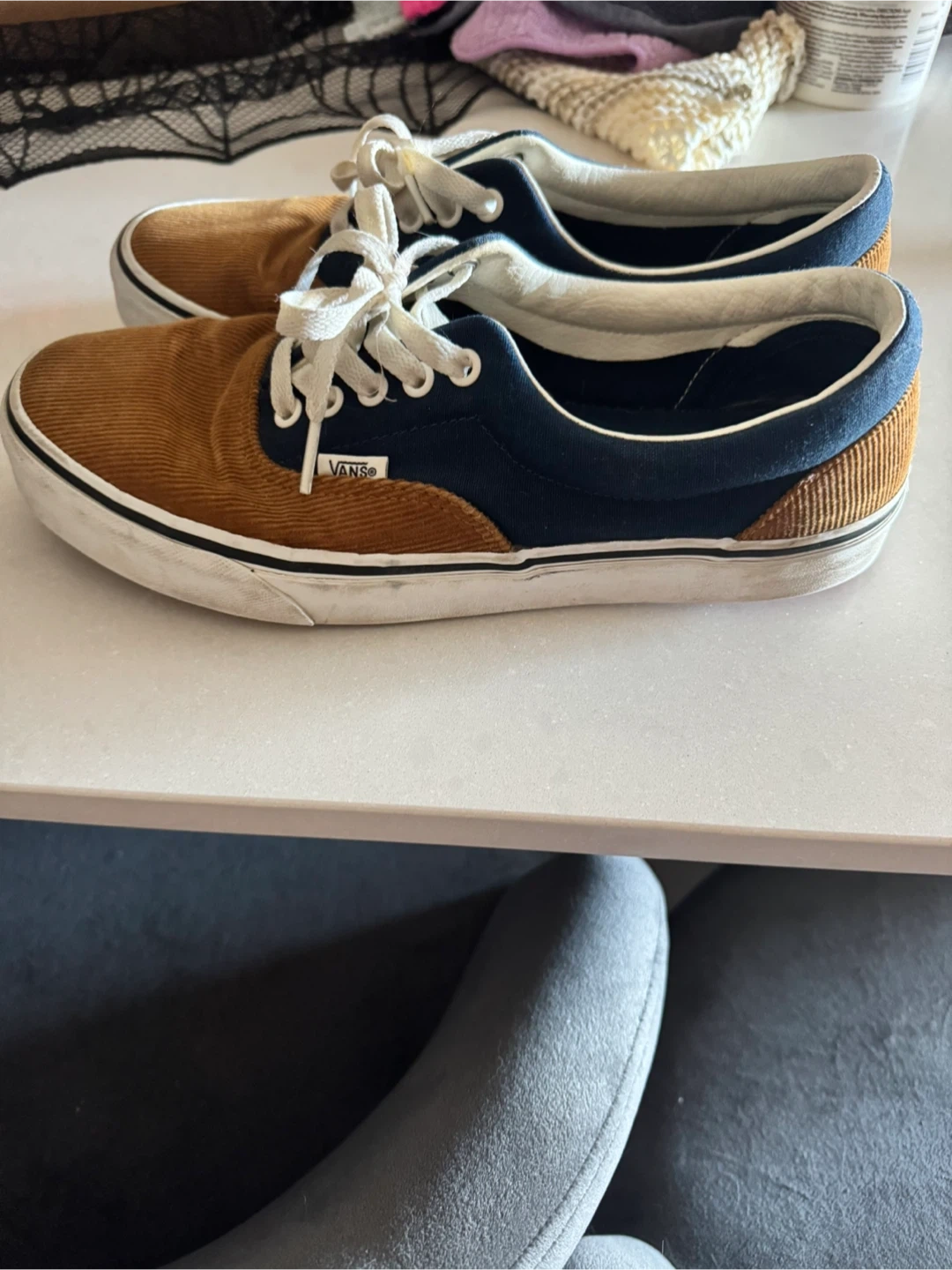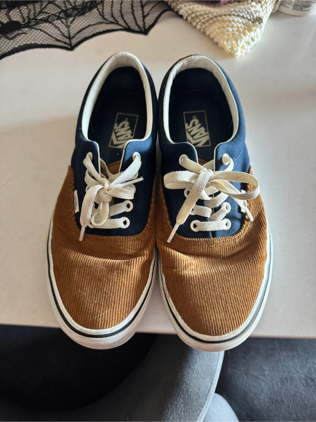 Selling a pair of Vans Era sneakers! They feature a cool corduroy design in brown and blue. The size is 9.5 for men. They are in great condition only worn twice as they are too small. Originally $100, not sold anymore