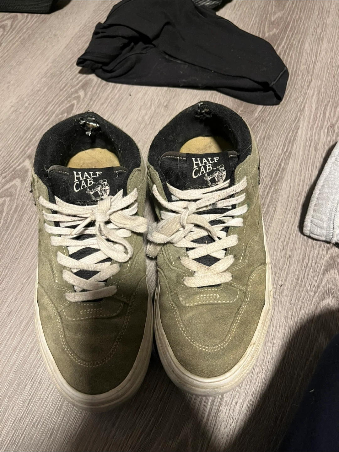 Selling a pair of Vans Half Cab shoes in olive green. They show some signs of wear, as you can see in the photos, especially on the soles and around the ankle area. Still lots of life left in them for skating or casual wear!
