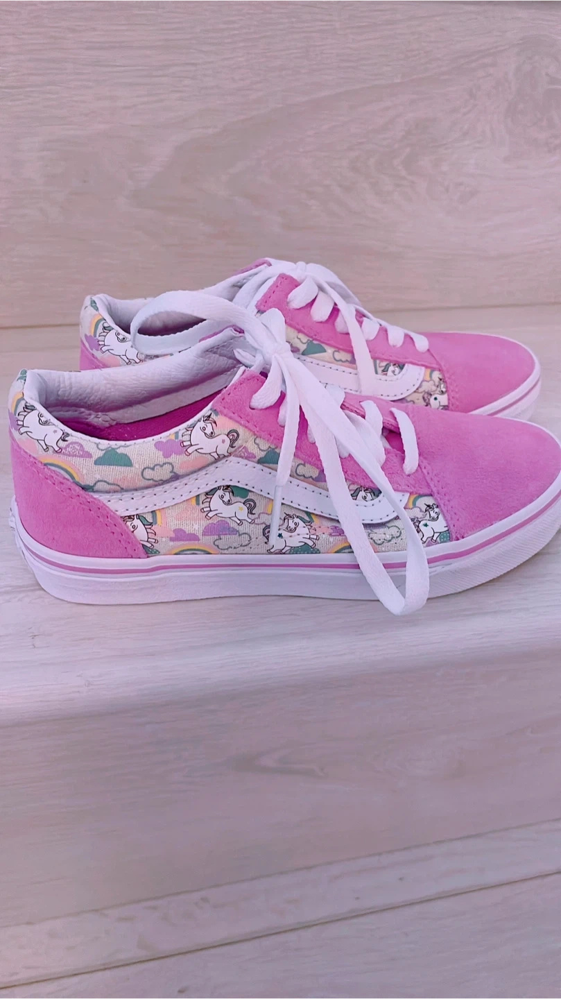 Super cute Vans Old Skool sneakers for kids! These are in a fun unicorn and rainbow print with pink suede accents. Size 2 for kids. Perfect for adding a pop of colour and whimsy to any outfit