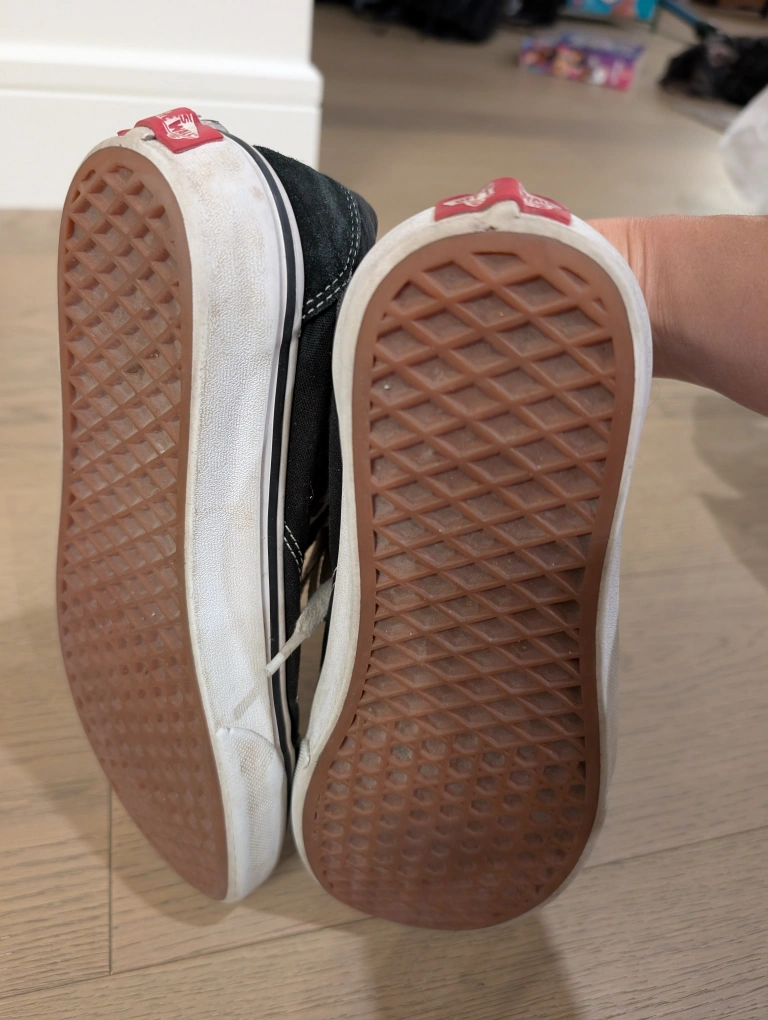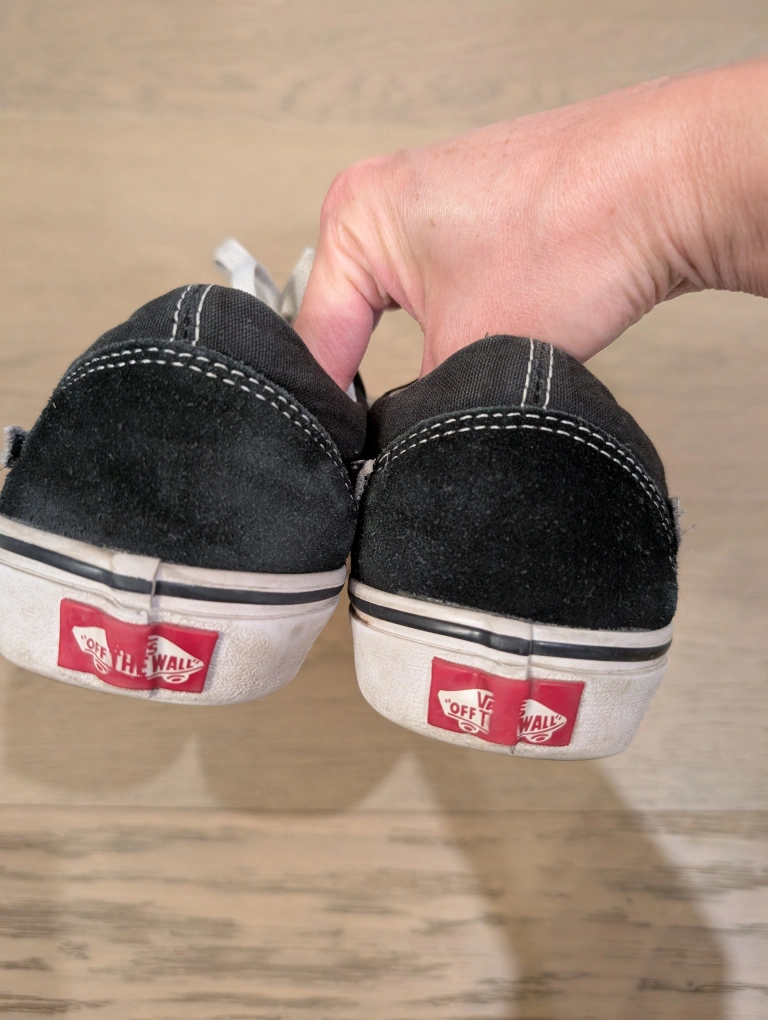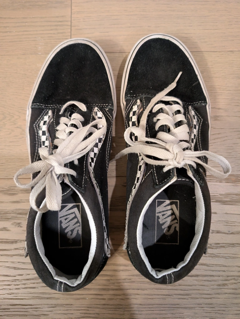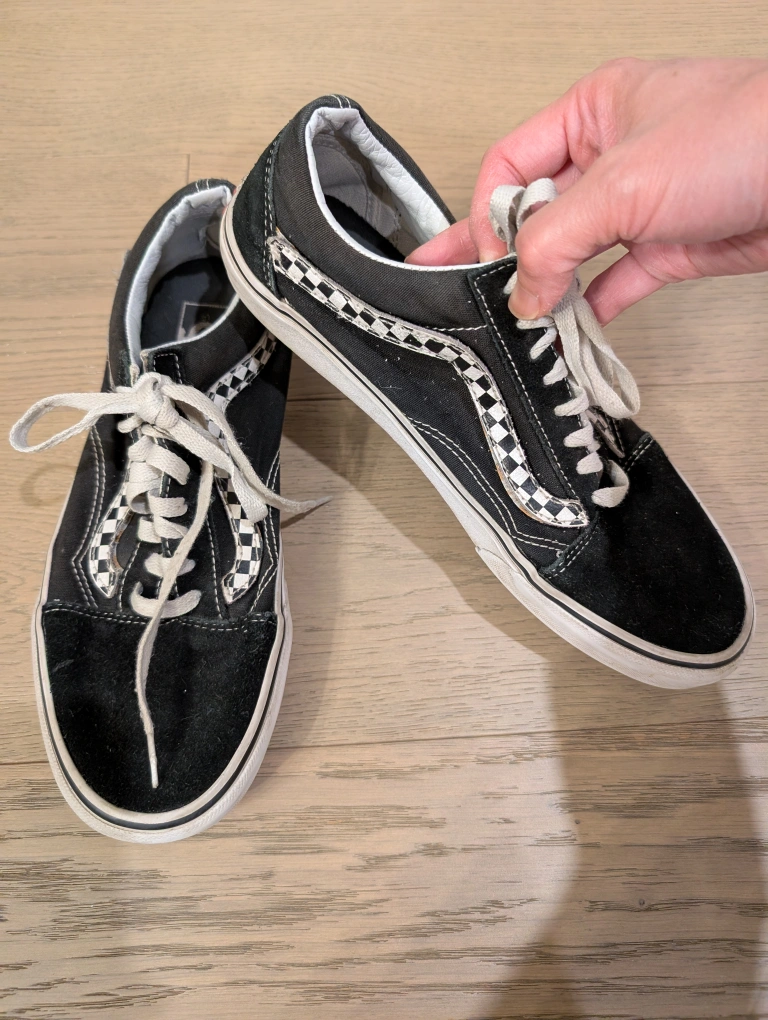 Selling a pair of Vansl shoes in black with a white checkered pattern. A classic and versatile style that goes with everything. Size 8.5 men's